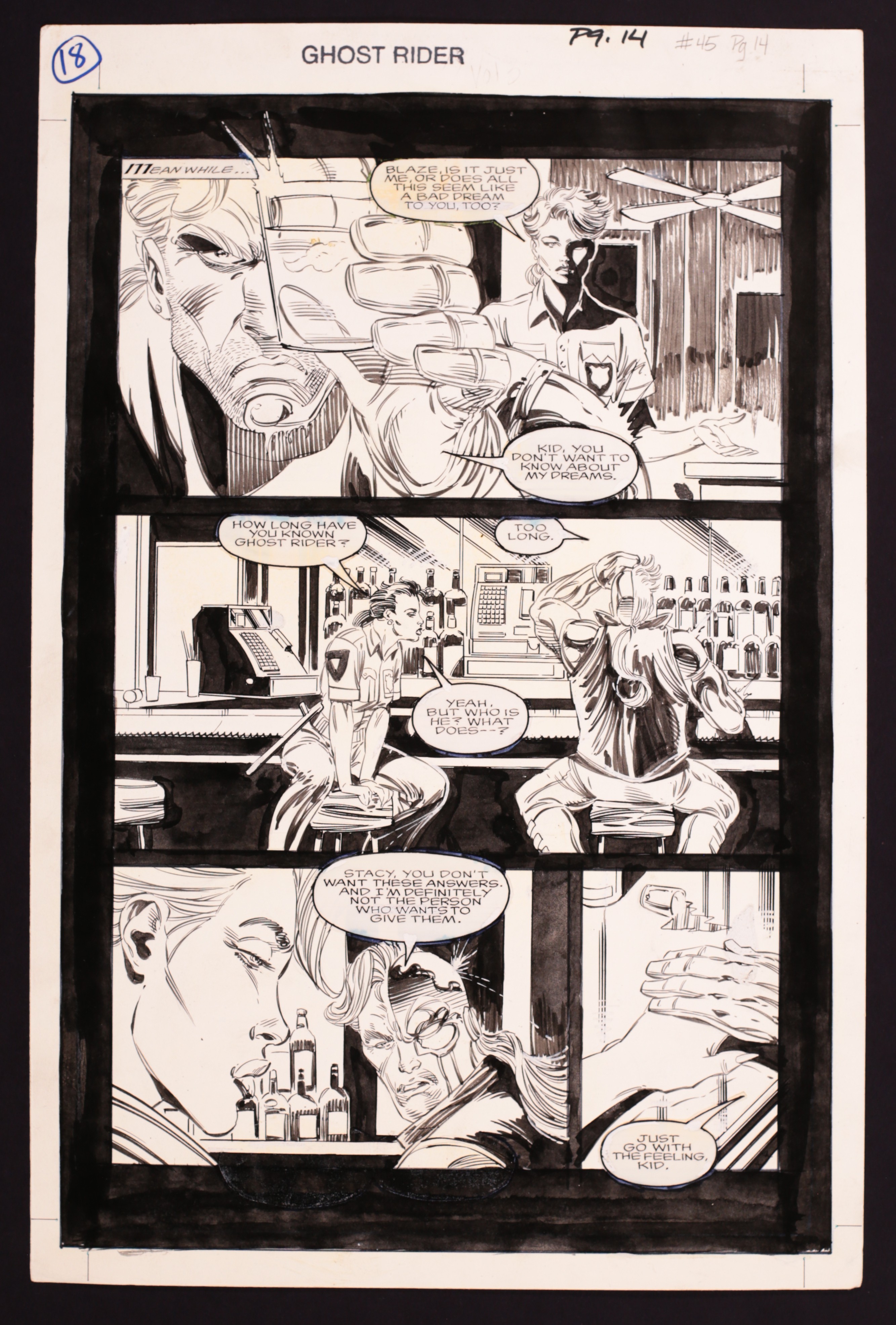 If there's two things that define Ghost Rider it's demonic, motorcycle, chain-whippin' action and surly people drinking hard in dive bars. This page is a wonderful example of the later with Ivy's brushwork creating a wonderful mood as Johnny Blaze (who was a cyborg at this point!) talks to Stacy Dolan- Danny Ketch's childhood friend and first romance. Also included is a copy of the published issue. Pencil and ink on art board. 11 1/4" x 17 1/4"