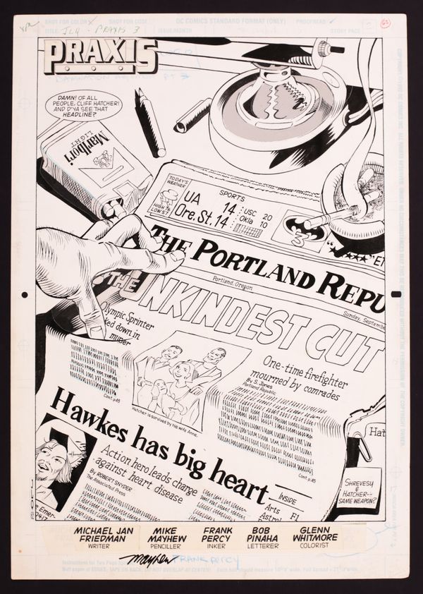 A fantastic title page full of detail and perfectly fitting for the more grounded, gritty story that follows telekinetic cop Jason Praxis as he tries to stop a serial killer. Also included is a copy of the published issue. Signed in bottom margin by the artists. Pencil, ink, and screentone with title stat on DC Comics art board. 11 1/2" x 16 1/2", B&W.