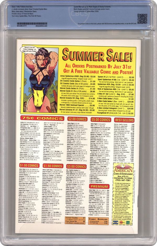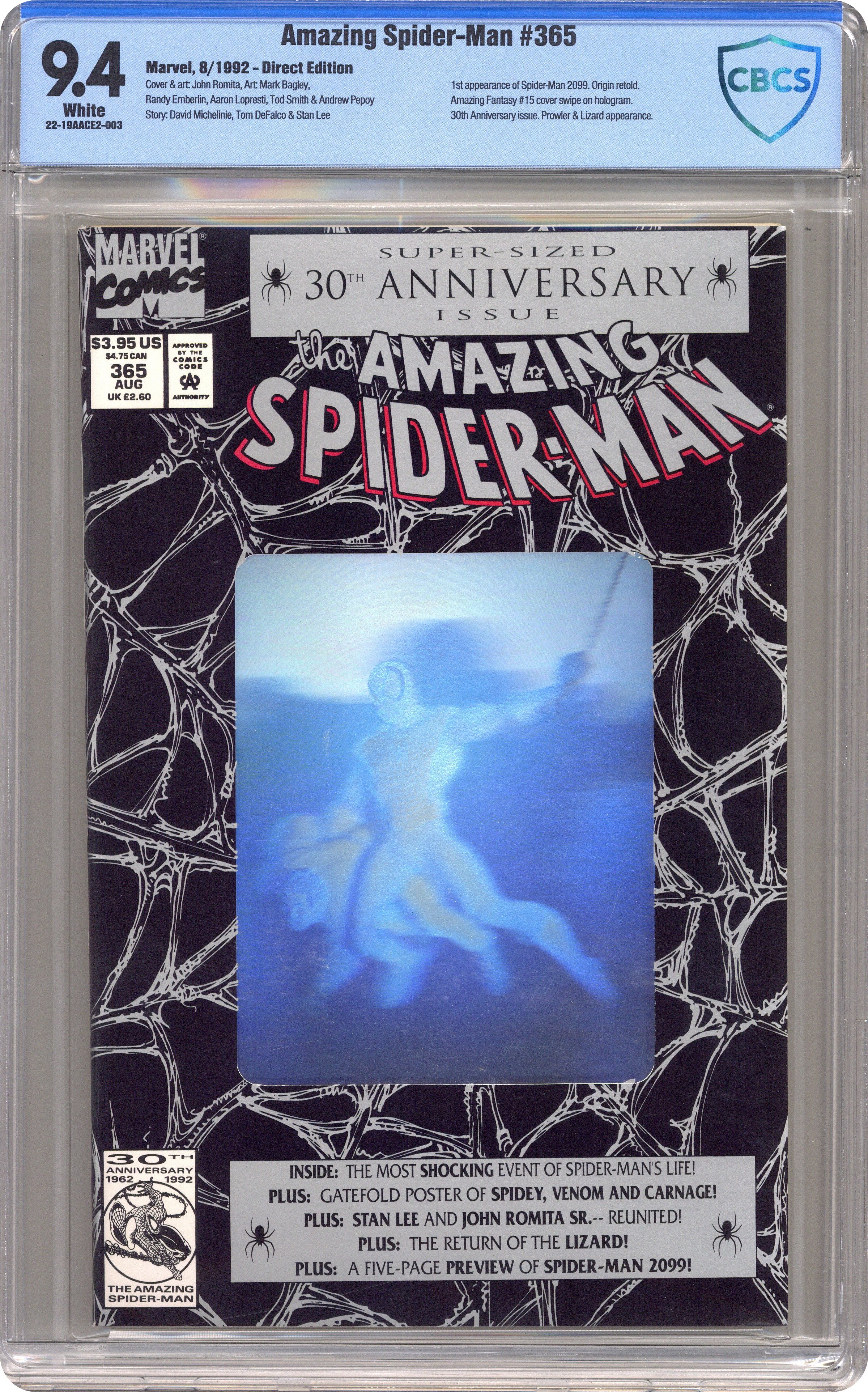 Direct Edition. 80-page giant 30th Anniversary issue, with the first appearance of Spider-Man 2099! The Lizard returns in "Fathers and Sins." Script by David Michelinie, pencils by Mark Bagley, inks by Randy Emberlin. J. Jonah Jameson is featured in "How I Created Spider-Man!" Script by David Michelinie, art by Aaron Lopresti. Gwen Stacy takes center stage in "I Remember Gwen." Script by Stan Lee, plot by Tom DeFalco, art by John Romita Sr. (Cameos by the Green Goblin and Doctor Octopus.) The Prowler is also here in "A Friend in Need." Script by Tom DeFalco, pencils by Tod Smith, inks by Andrew Pepoy. There are also two text pieces, "The Saga of Spidey's Parents" by Stan Lee, and "Spider-Man: The First Thirty Years" by Peter Sanderson. Spider-Man 2099 gets a sneak preview, with a script by Peter David, pencils by Rick Leonardi, and inks by Al Williamson. This issue was originally released with a fold-out poster of Spidey versus Venom and Carnage (poster may be missing in lower grades). 84 pgs. Cover price $3.95. Grade: CBCS 9.4 explanation of grade Condition: Used (collectible)