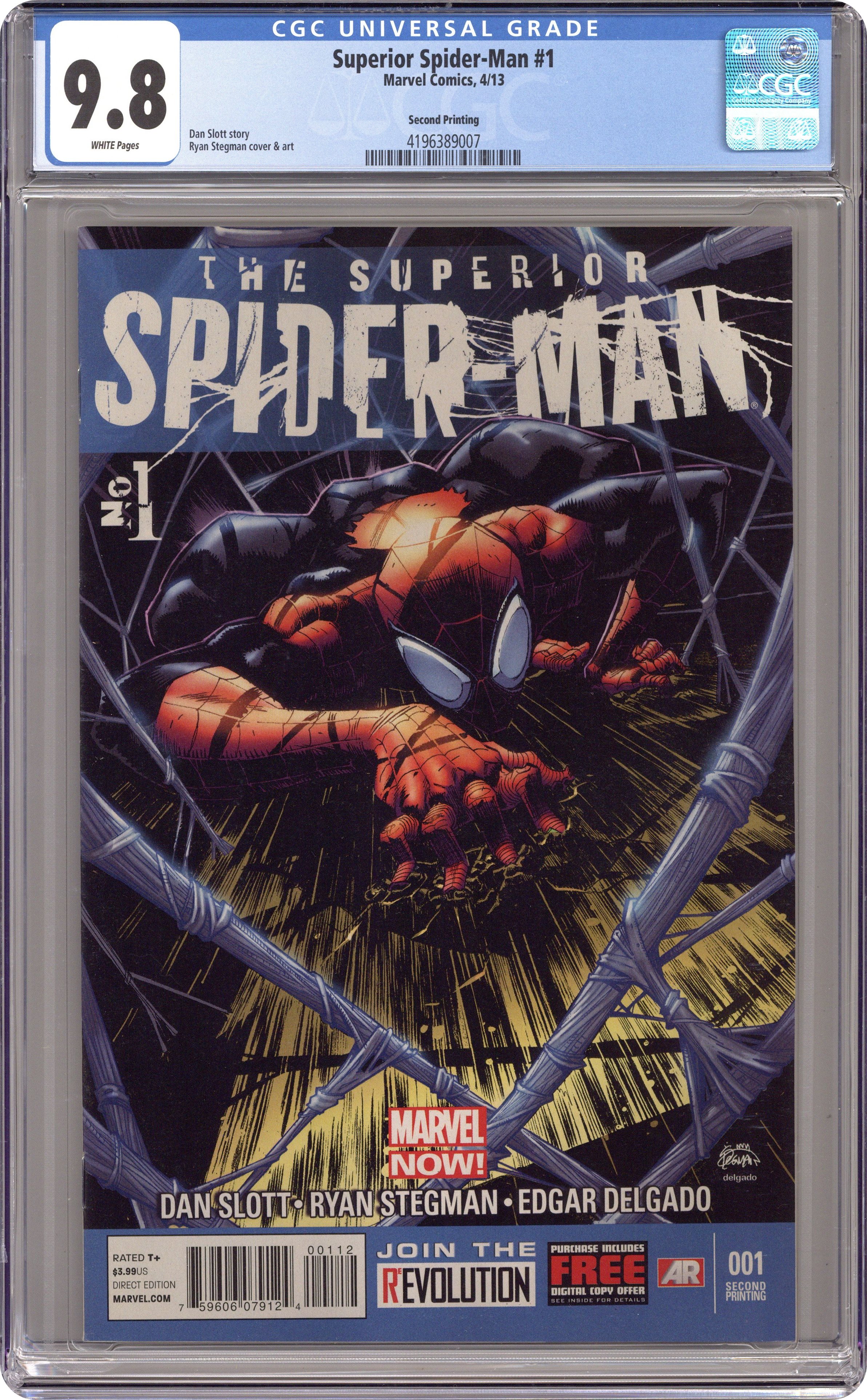 SECOND PRINTING Cover by Ryan Stegman (W) Dan Slott (A) Ryan Stegman THEN!...Peter Parker spent a lifetime living up to the responsibilities his powers foisted upon him but his Amazing story finally ended dramatically in the historic Spider-Man #700. NOW!...The new Amazing Spider-Man has arrived and he is better in every single way. Smarter, stronger...Superior. Cover price $3.99. Grade: CGC 9.8 explanation of grade Condition: Used (collectible)