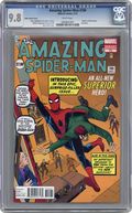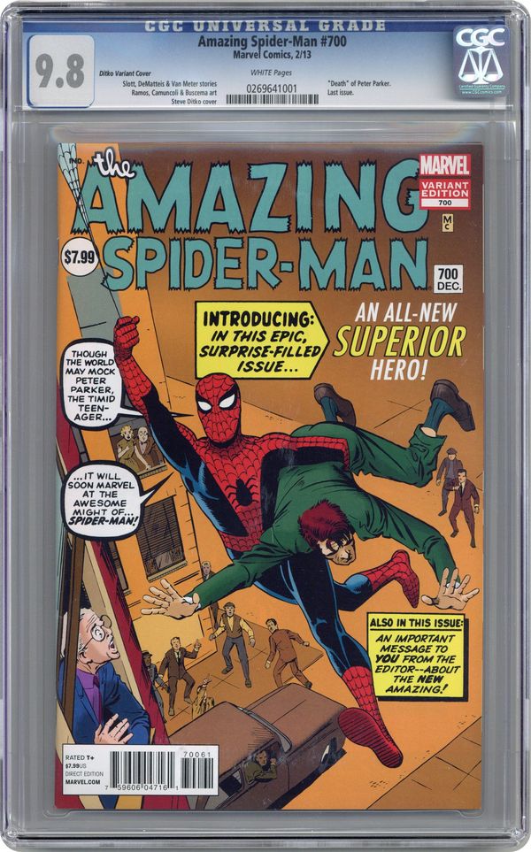Limited 1 for 200 Variant Cover by Steve Ditko. Dying Wish: Part 2 of 2. Written by Dan Slott, J.M. DeMatteis and Jen Van Meter. Art by Humberto Ramos, Giuseppe Camuncoli, Stephanie Buscema, Victor Olazaba and Sal Buscema. Marvel Comics proudly presents the end of a 700 issue era! Featuring "Dying Wish: Suicide Run" by Dan Slott, Humberto Ramos and Victor Olazaba. Plus these extra amazing, spectacular and sensational stories: "Spider-Dreams" by J.M. DeMatteis, Giuseppe Camuncoli and Sal Buscema, and "Date Night: A Black Cat Storybook Adventure!" by Jen Van Meter and Stephanie Buscema. Also: cover gallery featuring all 700 Amazing Spider-Man covers; special previews of the all-new Spidey books; and the final Amazing Spider-Mail featuring Stan "The Man" Lee answering your questions! 104 pages, full color. Rated T+ Cover price $7.99. Grade: CGC 9.8 explanation of grade Condition: Used (collectible)