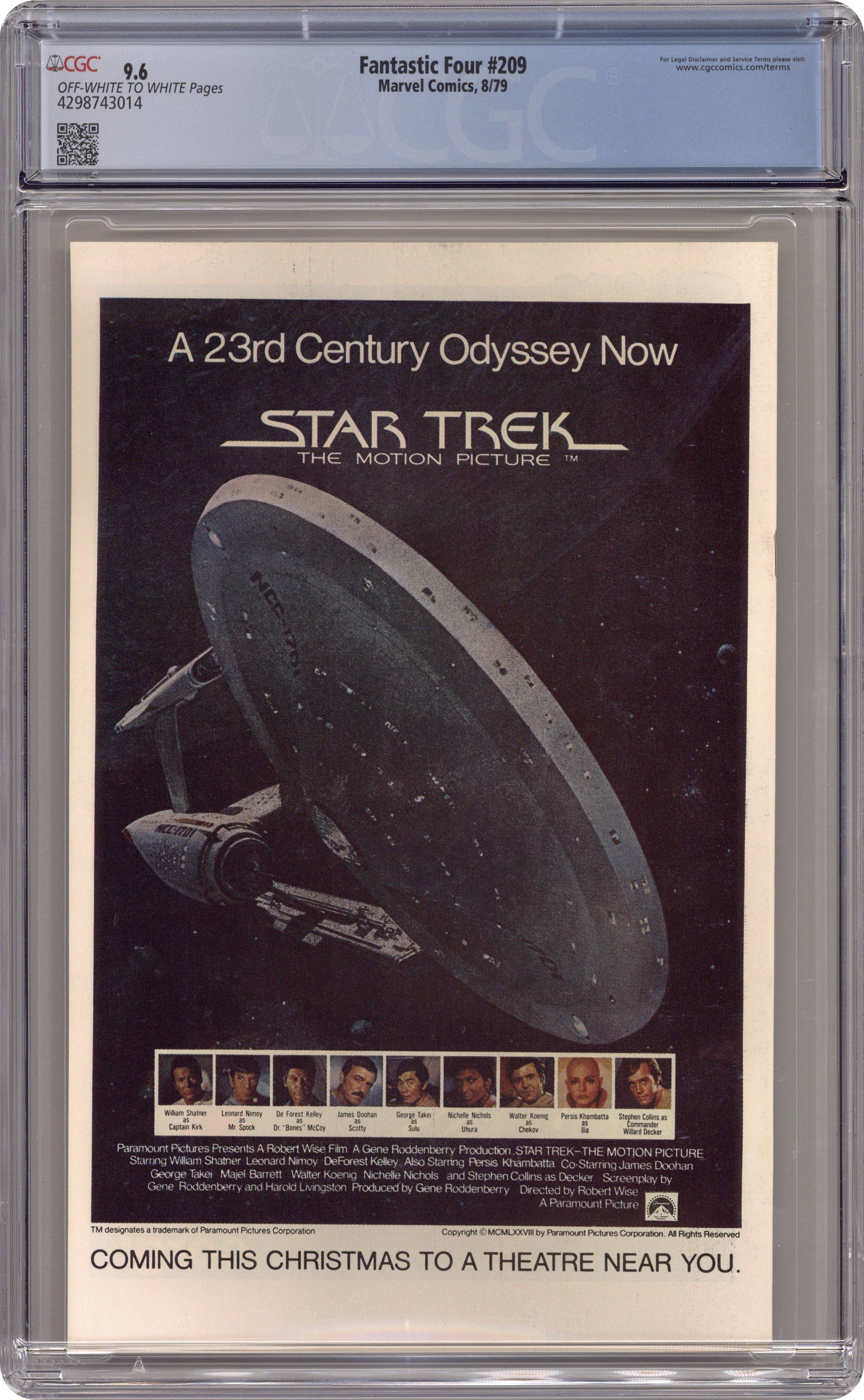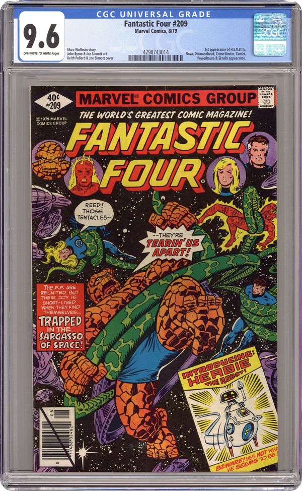 Direct Edition. "Trapped in the Sargasso of Space!" Written by Marv Wolfman. Pencils by John Byrne (first work on the series). Inks by Joe Sinnott. Cover by Keith Pollard and Joe Sinnott. Reed Richards has decided that only one person in the entire universe can prevent the Sphinx from destroying the Earth...Galactus! But first, can the FF find the Ravager of Worlds? And second, can they convince him to journey to Earth and save the planet? The quest begins in the Sargasso of space! Cameo appearances by Nova, Comet, Crimebuster, Diamondhead, and Powerhouse. Note: First appearance of Herbie the Robot, who was the fourth member of the Fantastic Four (instead of the Human Torch) on the FF's Saturday morning cartoon show. NOTE: To learn the final fate of Nova (Richard Rider) follow his story in the pages of Rom (1979) #24. - Odinson, mycomicshop Archivist. 36 pgs. Cover price $0.40. Grade: CGC 9.6 explanation of grade Condition: Used (collectible)