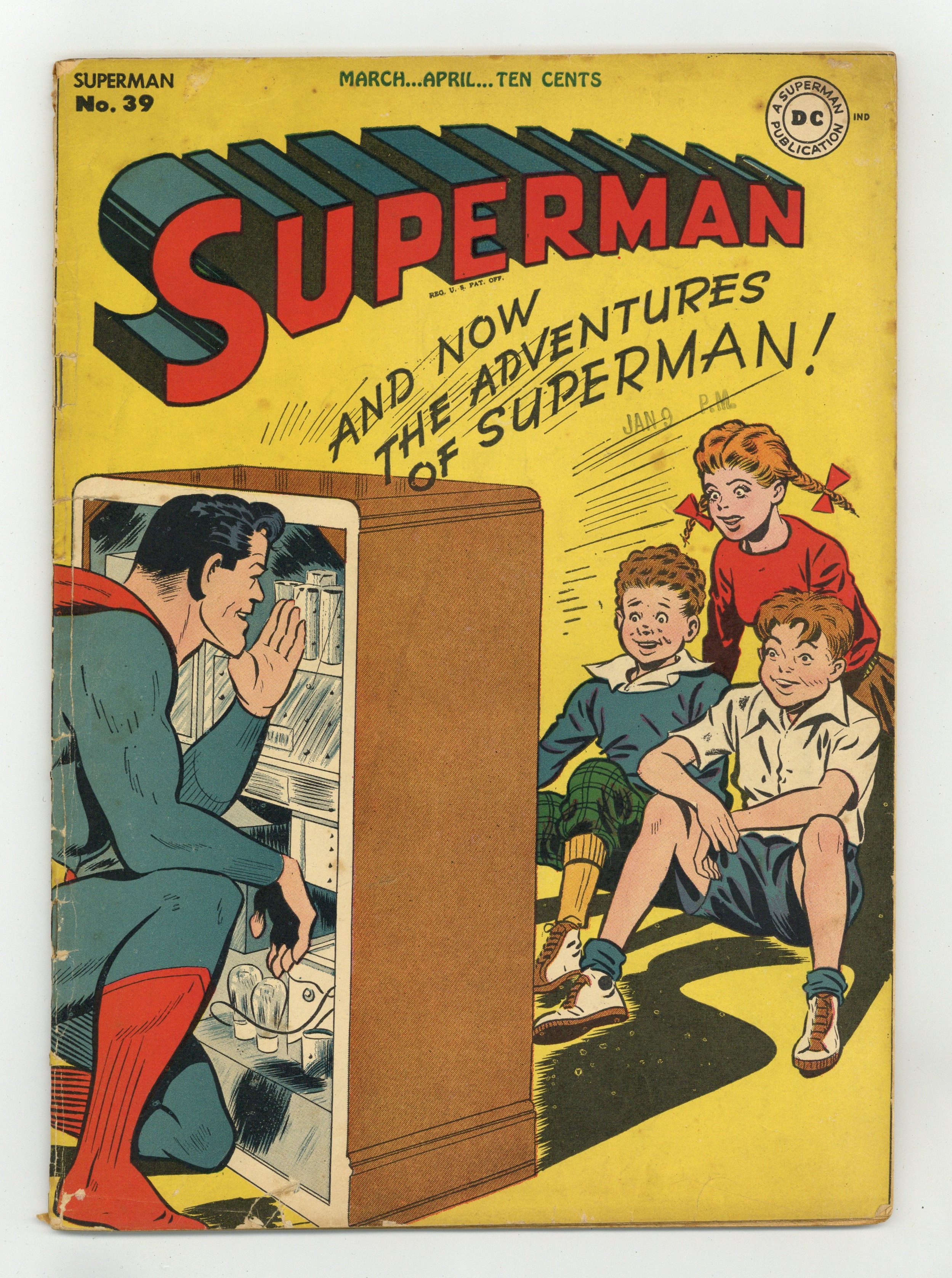 Ended Oct 9 2023 Winning Bid $258 Cover pencils by Jack Burnley. The Big Superman Broadcast, pencils by Joe Shuster, inks by George Roussos; 1st Superman radio show. The Monster of China Deep starring Superman, Captain Spears, and Lois Lane, pencils by Ira Yarbrough. Picture Frame text story by Whitney Ellsworth [as Fred Whitby]. Lois Lane story, script by Whitney Ellsworth, art by Sam Citron. Swindle In Sweethearts starring Superman, Wilbur Wolfingham, and Lois Lane, script by Don Cameron, pencils by Ira Yarbrough. 52 Pages, Full Color. Cover price $0.10. Grade: VG- 3.5 explanation of grade Condition: Used (collectible)