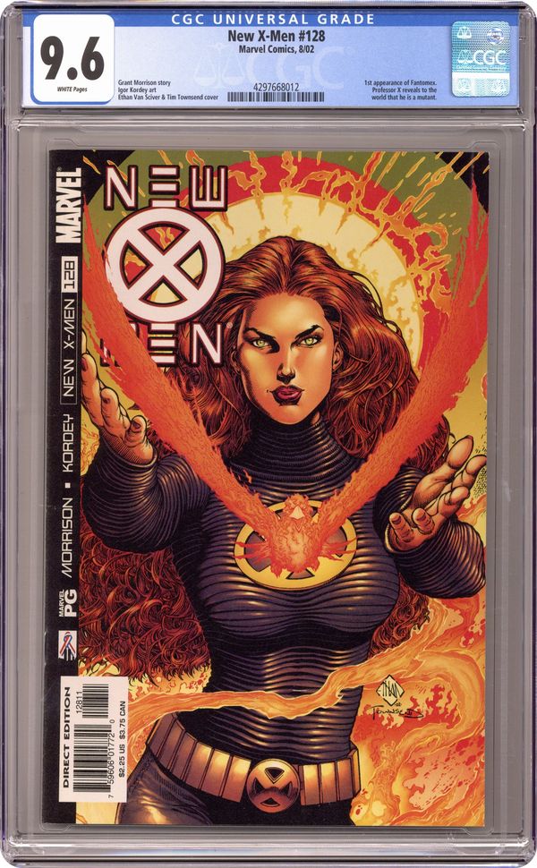 Direct Edition. Written by Grant Morrison. Art by Igor Kordey. Cover by Ethan Van Sciver & Tim Townsend. It's NEW X-MEN action -- twice this month! THE STORY: In a search for clues about her growing telekinetic strength, Professor X and Jean Grey jet off to Paris to probe the boundaries of Marvel Girl's Phoenix Force! Meanwhile, back at the Institute, while the cat is away, Emma Frost makes her big move on Cyclops! Featuring the first appearance of Fantomex. Cover price $2.25. Grade: CGC 9.6 explanation of grade Condition: Used (collectible)