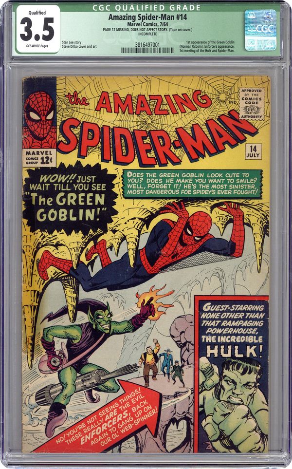 Ended Oct 25 2023 Winning Bid $821 Cover art by Steve Ditko. First appearance of the Green Goblin (Norman Osborn) in The Grotesque Adventure of the Green Goblin!, script by Stan Lee, art by Steve Ditko; The Green Goblin hires the Enforcers to help him defeat Spider-Man; To further his plan he convinces B.J. Cosmos to film a movie of Spider-Man fighting Goblin and the Enforcers in the desert; While filming, Goblin and the Enforcers attack Spider-Man and accidentally awaken the Hulk. Reprinted in Marvel Tales # 9 and 152. 36 pgs. $0.12. Cover price $0.12. Grade: CGC 3.5 explanation of grade Condition: Used (collectible)