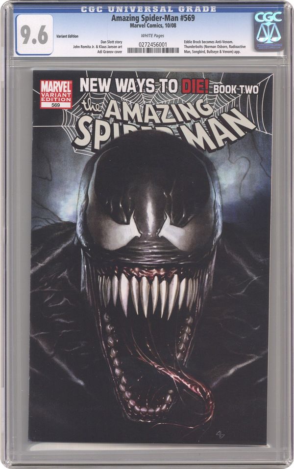 NEW WAYS TO DIE: Part 2 of 6 - Written by DAN SLOTT. Pencils by JOHN ROMITA JR. Cover by ADI GRANOV. SPIDEY'S a villain? NORMAN OSBORN'S a hero? What kind of crazy, mixed-up world is this? Next thing you'll tell us is that black is white and white is black...Or maybe that has something to do with VENOM, MISTER NEGATIVE, and the birth of an all-new Spider Villain! Or would that be an all-new Spider-Hero? Either way, True Believer, this is a 1st appearance you do NOT want to miss! 36 PGS. Rated A Cover price $2.99. Grade: CGC 9.6 explanation of grade Condition: Used (collectible)