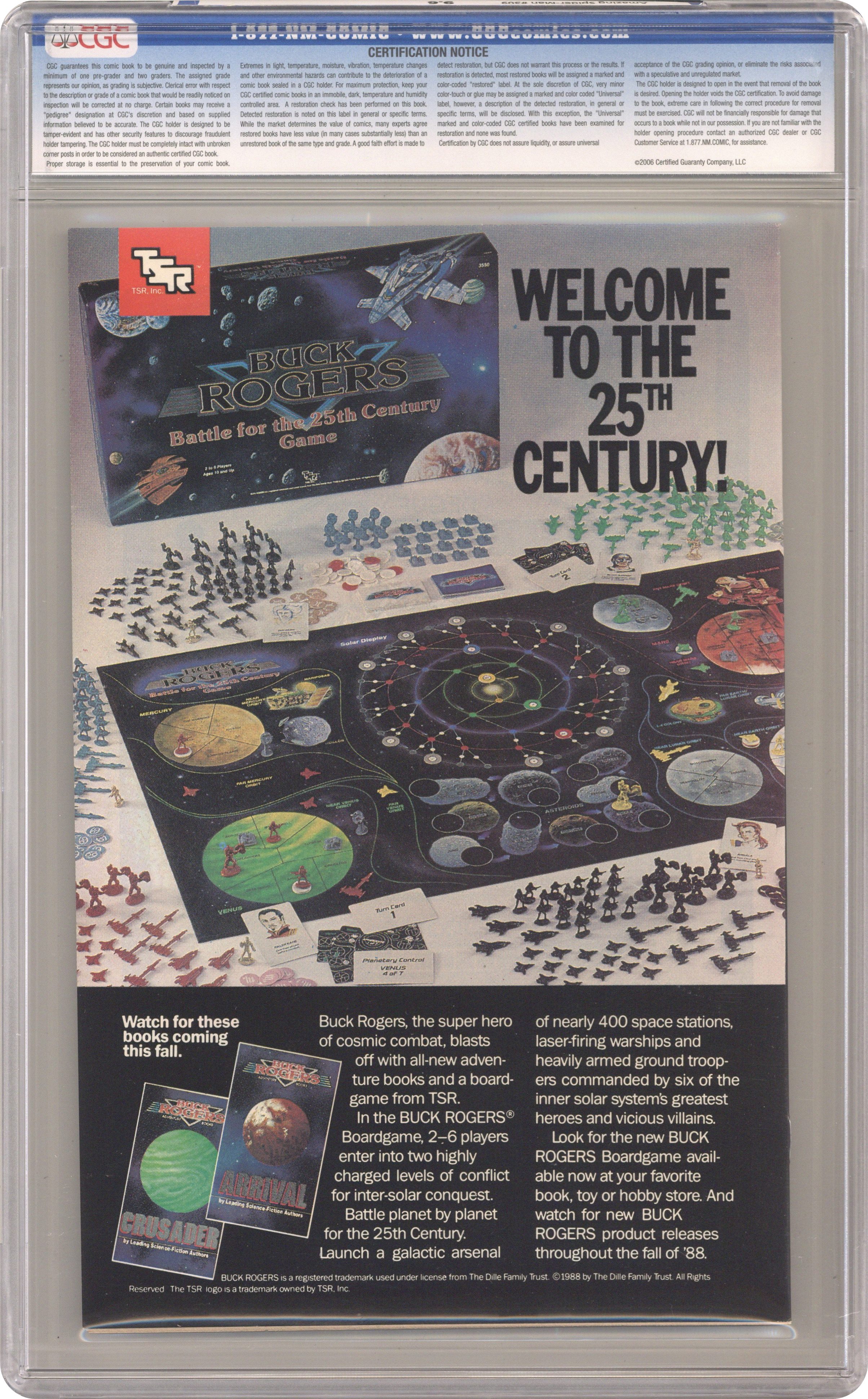Direct Edition. "Styx and Stone!" Part 2 of 2. Script by David Michelinie. Art by Todd McFarlane. Cover by Todd McFarlane. The Amazing Spider-Man continues to comb the city for his dear wife Mary Jane! And word of the web-slinger's frantic search reaches Jonathan Caesar! As a result the demented businessman hires two creepy assassins to exterminate the wall-crawler! When Styx and Stone ambush the amazing one in Central Park, it looks indeed like Spidey's bones will be broken! But help from an unlikely redhead may save the day! First appearance of Styx and Stone. Cameo appearances by Glory Grant, J. Jonah Jameson, Joe Robertson, and Sergeant Tork. (Note: Styx and Stone return in Amazing Spider-Man 332.) 32 pages. Cover price $1.00. Grade: CGC 9.6 explanation of grade Condition: Used (collectible)