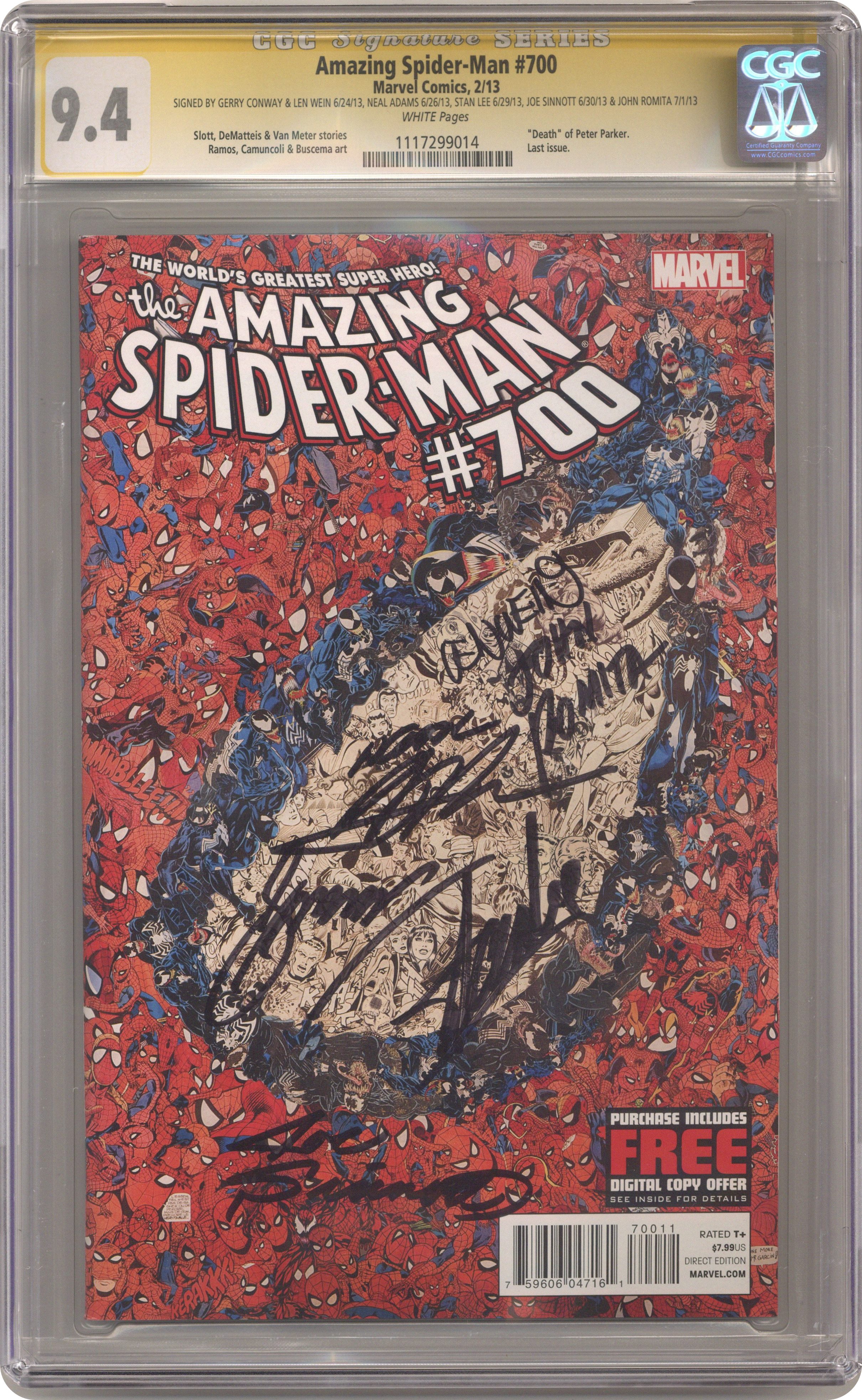 Direct Edition. Dying Wish: Part 2 of 2. Written by Dan Slott, J.M. DeMatteis and Jen Van Meter. Art by Humberto Ramos, Giuseppe Camuncoli, Stephanie Buscema, Victor Olazaba and Sal Buscema. Cover by Mr Garcin. Marvel Comics proudly presents the end of a 700 issue era! Featuring "Dying Wish: Suicide Run" by Dan Slott, Humberto Ramos and Victor Olazaba. Plus these extra amazing, spectacular and sensational stories: "Spider-Dreams" by J.M. DeMatteis, Giuseppe Camuncoli and Sal Buscema, and "Date Night: A Black Cat Storybook Adventure!" by Jen Van Meter and Stephanie Buscema. Also: cover gallery featuring all 700 Amazing Spider-Man covers; special previews of the all-new Spidey books; and the final Amazing Spider-Mail featuring Stan "The Man" Lee answering your questions! 104 pages, full color. Rated T+ Cover price $7.99. Grade: CGC 9.4 explanation of grade Condition: Used (collectible)
