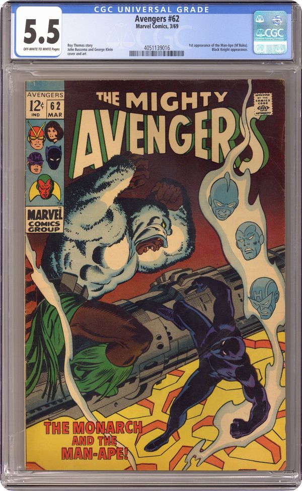Ended Mar 26 2024 Winning Bid $35 "The Monarch and the Man-Ape" First appearance of the Man-Ape. Script by Roy Thomas. Pencils by John Buscema. Inks by George Klein. Cover by John Buscema and George Klein. After their encounter with Ymir and Surtur, the Avengers travel to the Black Panther's homeland to recuperate! But unfortunately there is something rotten in the state of Wakanda! M'Baku, one of T'Challa's mightiest warriors, has usurped the throne and secretly taken on the identity of the Man-Ape! However, the Avengers don't know that when they sit down for the evening feast! Once his teammates succumb to M'Baku's drugged wine, the Black Panther must face his royal challenger alone! In the heart of the jungle, T'Challa battles for his throne and his life vs. the ferocious Man-Ape! Appearance by the Black Knight. Avengers Lineup: Black Panther, Hawkeye, and the Vision. (Notes: The Man-Ape returns in Avengers 78. The cover logo changes to "The Mighty Avengers" thru issue 69. The letters page also contains a statement of ownership: average print run 428,600; average paid circulation 276,951. This story was reprinted in Jungle Action 5.) 36 pages. 12 cent cover price. Cover price $0.12. Grade: CGC 5.5 explanation of grade Condition: Used (collectible)