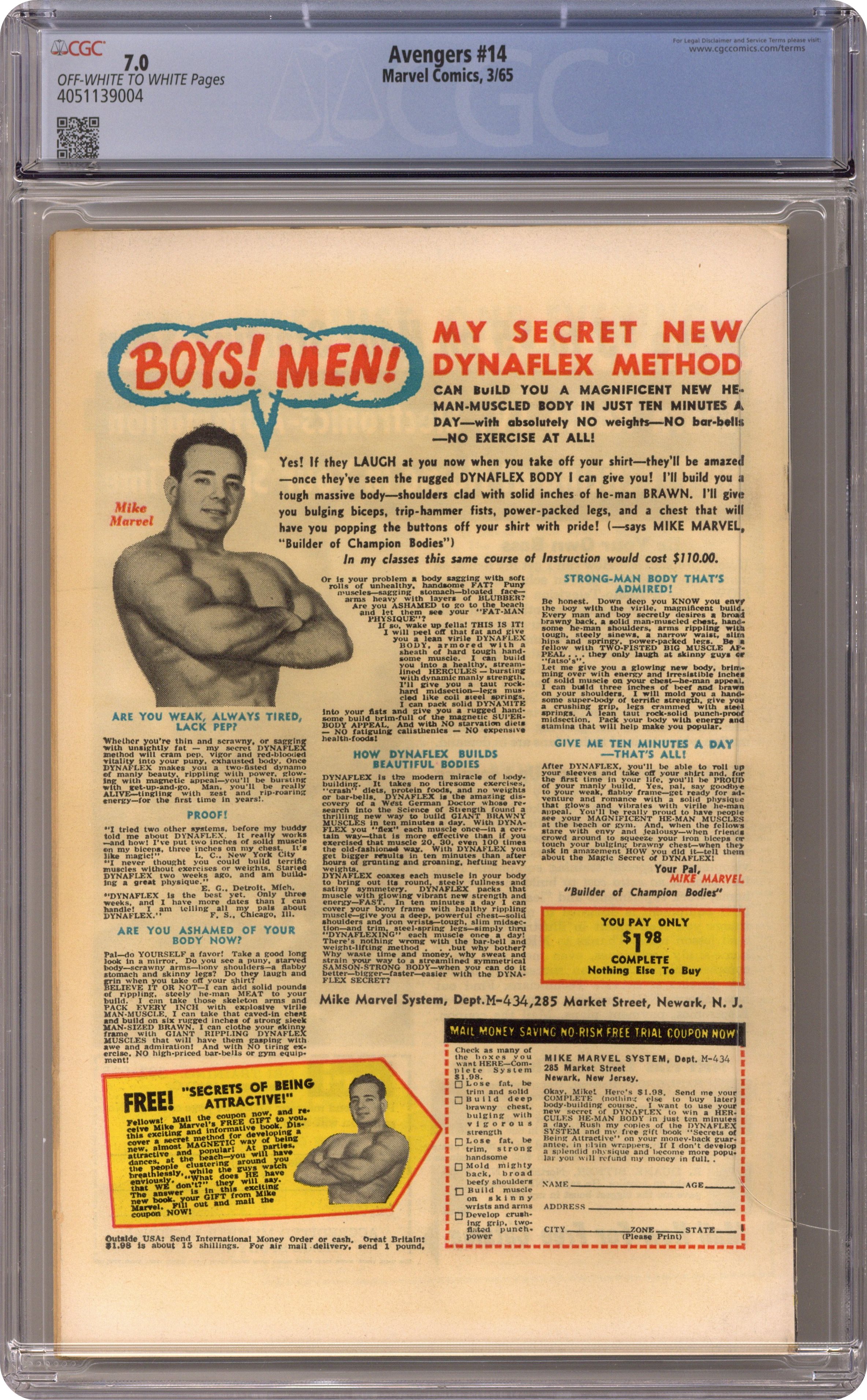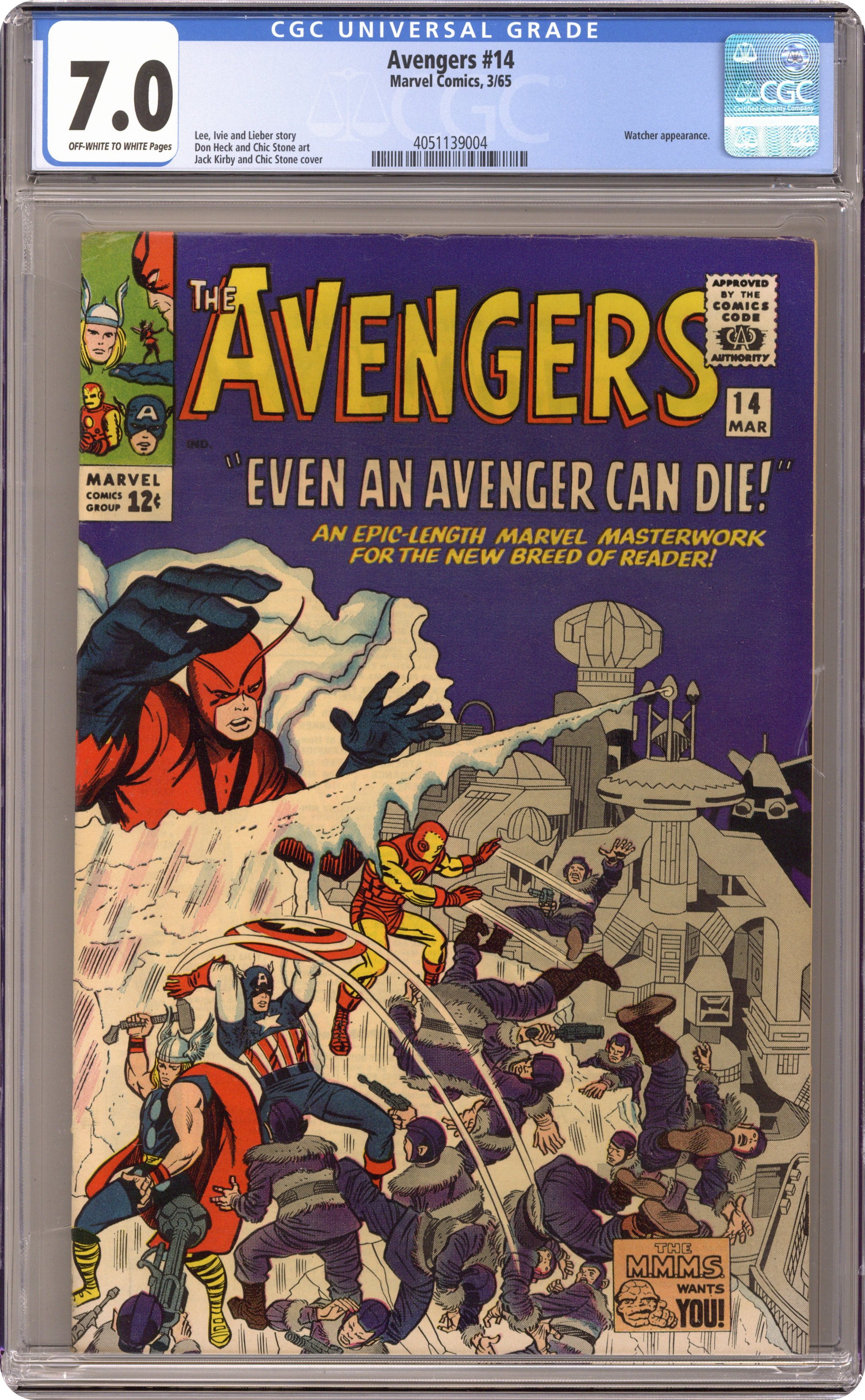 Ended Oct 11 2023 Winning Bid $106 Cover pencils by Jack Kirby, inks by Chic Stone. Even Avengers Can Die!, script by Stan Lee (plot), Larry Ivie [as Paul Laiken] (script), and Larry Lieber (script), pencils by Jack Kirby (layouts) and Don Heck (pencils), inks by Chic Stone; In order to save the Wasp's life, the Avengers seek out the help of Dr. Svenson, only to find he's been replaced by an alien from the planet Kallu. Avengers Roll Call: Captain America, Thor, Iron Man, Giant Man, Wasp, and Rick Jones. First and only appearance of the villainous Ogor and the Kallusians. Guest appearance by the Watcher. Reprinted in Marvel Triple Action #8. 36 pgs. $0.12. Cover price $0.12. Grade: CGC 7.0 explanation of grade Condition: Used (collectible)