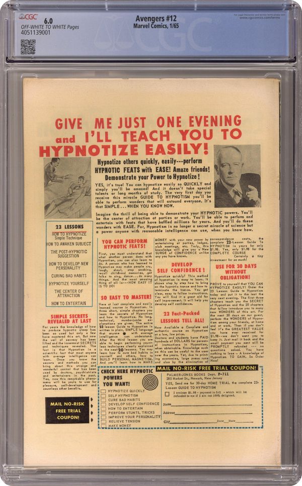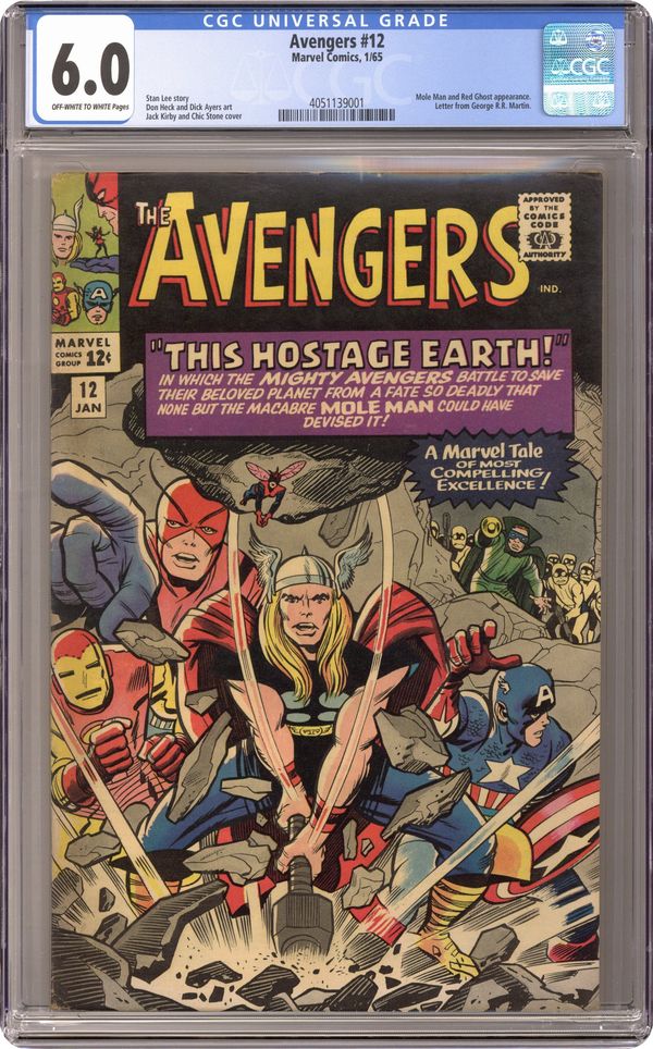 Cover pencils by Jack Kirby, inks by Chic Stone. "This Hostage Earth!", script by Stan Lee, pencils by Don Heck, inks by Dick Ayers; Ants warn Giant Man that there is something wrong, but none of the other Avengers believe him; In truth, it is the Mole Man, who plans to destroy the surface world by making the Earth spin very fast on its axis; And now, with his new ally the Red Ghost, how can he be stopped? Avengers Roll Call: Captain America, Thor, Iron Man, Giant Man, Wasp, and Rick Jones. Villains: the Red Ghost, the Mole Man, and the first appearance of Monk Keefer. Flashback cameos by Mr. Fantastic, Invisible Girl, and Human Torch (of the Fantastic Four). Letters to the editor from science fiction writer George R.R. Martin and Steve Erickson (the writer?). Reprinted in Marvel Triple Action # 6. 36 pgs., full color. $0.12. Cover price $0.12. Grade: CGC 6.0 explanation of grade Condition: Used (collectible)