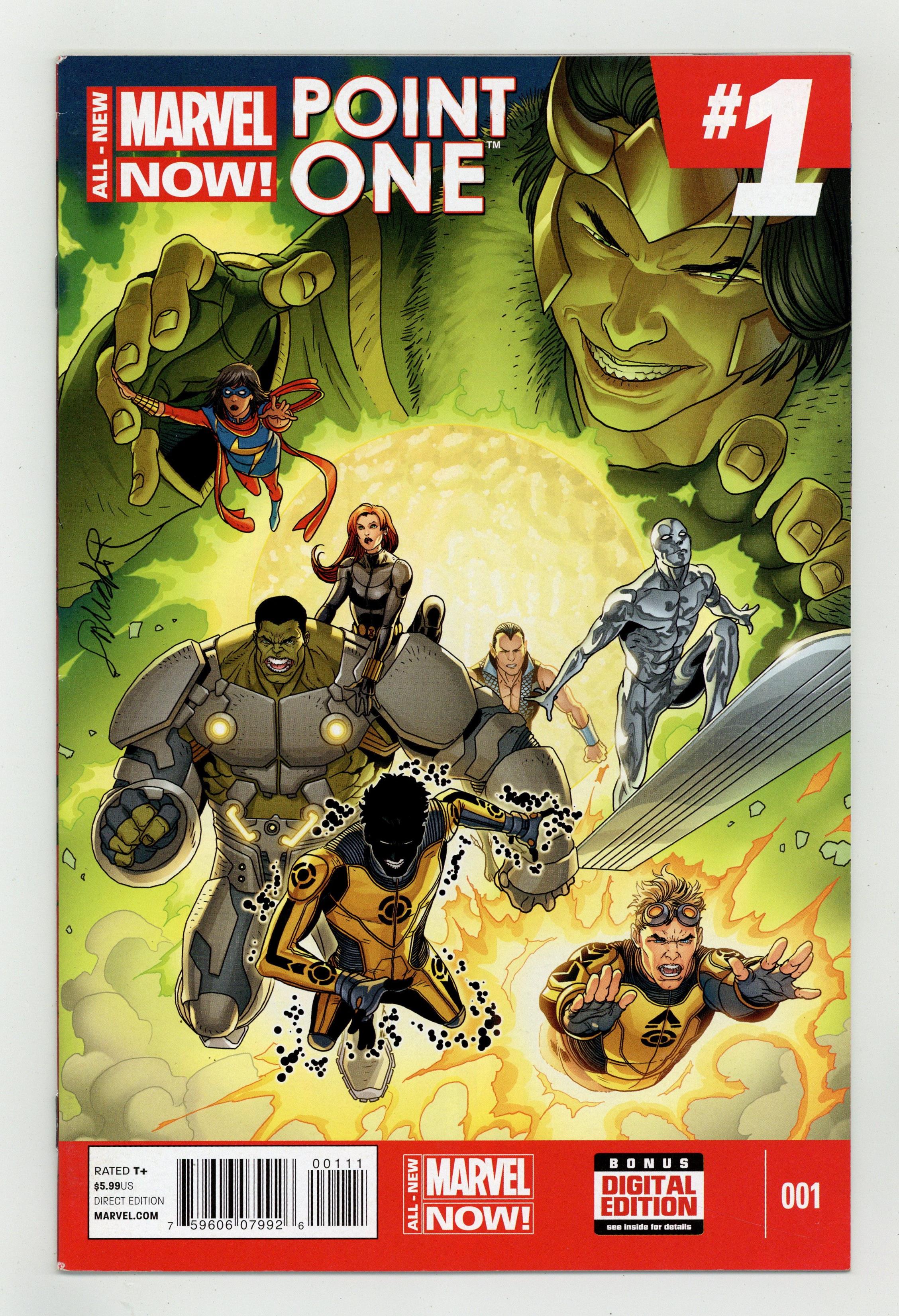 Cover by Salvador Larroca. Written by Al Ewing, Dan Slott, James Robinson, Nathan Edmondson, G. Willow Wilson, Nick Spencer. Art by Lee Garbett, Michael Allred, Steve Pugh, Phil Noto, Adrian Alphona, Rags Morales. Here we go again! It's your one-stop entry point to the world of ALL-NEW MARVEL NOW! Loki embarks on a mission for Asgard! The Silver Surfer and Dawn experience the cosmic rays of Nautikos! A Kree Pursuer and her Special Forces team prepare to invade the Earth! The Black Widow goes undercover in Russia! Who is the new Ms. Marvel? And can even the Indestructible Hulk survive the aid and assistance of fellow Avengers Cannonball and Sunspot? • Features completely new LOKI: AGENT OF ASGARD, SILVER SURFER, BLACK WIDOW, MS MARVEL, ALL-NEW INVADERS and AVENGERS WORLD lead-in stories! Note: First appearance of Kamala Khan as Ms. Marvel Cover price $5.99. Grade: VF- 7.5 explanation of grade Condition: Used (collectible)