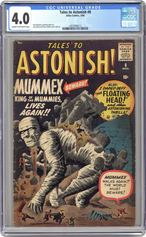 Ended Jan 22 2024 Winning Bid $191 Cover by Jack Kirby and Steve Ditko. I Dared Defy the Floating Head!, art by Paul Reinman; A giant floating head appears over New York, claiming that it is the advance scout of an alien invasion, and ordering everyone to evacuate. I Live Again!, art by Steve Ditko; The animated statue rises up from where it fell in the last story and decides to go to America so that it can conquer the world. New Glasses text story. I–Am–The–Genie!, art by Jack Kirby and Steve Ditko; A criminal finds a genie and uses it to wreak havoc, but when he goes too far he takes the genies place in the bottle. Mummex---King of the Mummies!, art by Don Heck; An archaeologist finds a giant mummy in the Egyptian desert; It rises and searches the tombs and museums of the area, examining several mummies before returning into the desert. 36 pgs., full color. $0.10. Cover price $0.10. Grade: CGC 4.0 explanation of grade Condition: Used (collectible)