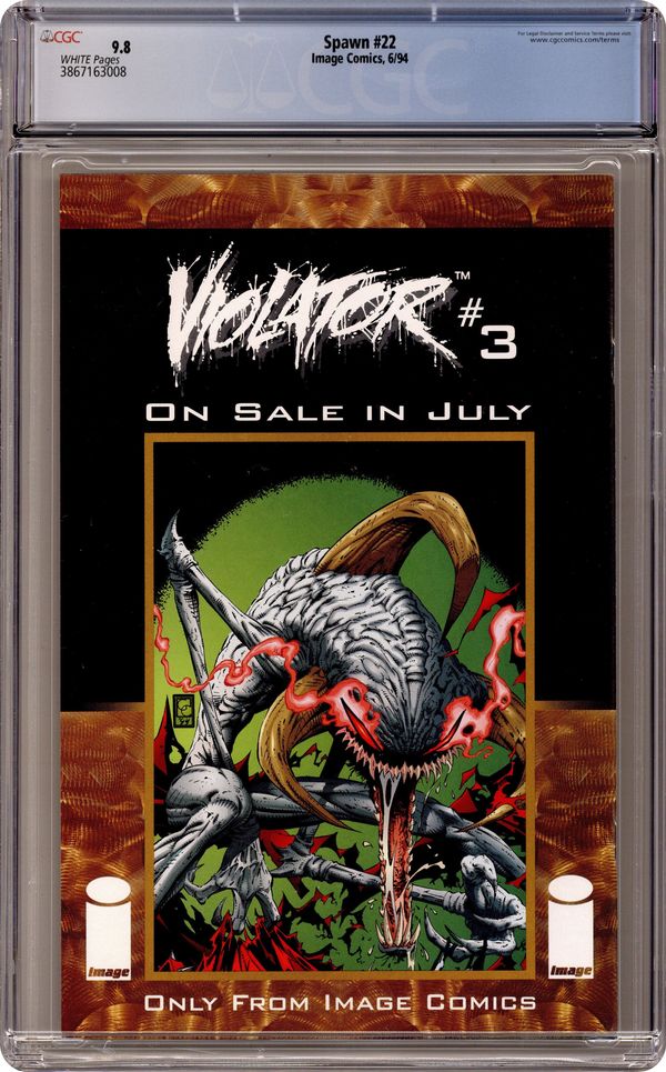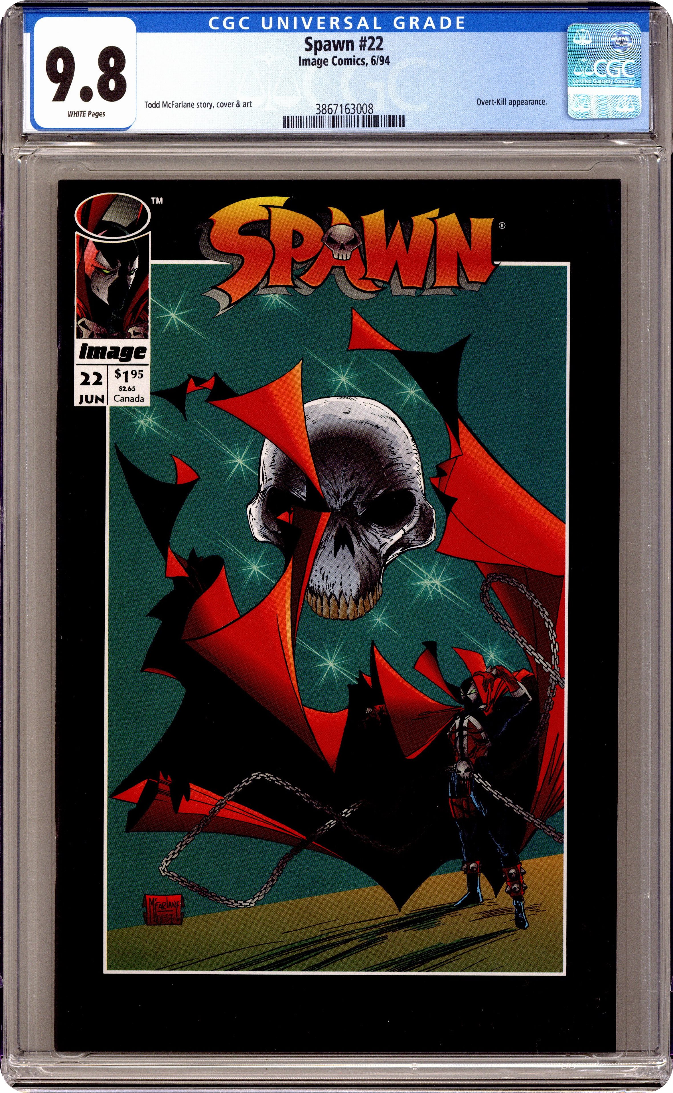 Direct edition. "The Hunt!" Part 2 of 4. Story and art by Todd McFarlane. Tony Twist believes Spawn is actually Terry Fitzgerald, Al Simmons' best friend when he was alive and the man who is now married to Al's widowed wife. But can even the power of Spawn save Terry from the cybernetic killing machine known as Overtkill? Includes a Savage Dragon pin-up by Erik Larsen and an 8-page ad for WildC.A.T.s: The Animated Series. Cover price $1.95. Grade: CGC 9.8 explanation of grade Condition: Used (collectible)