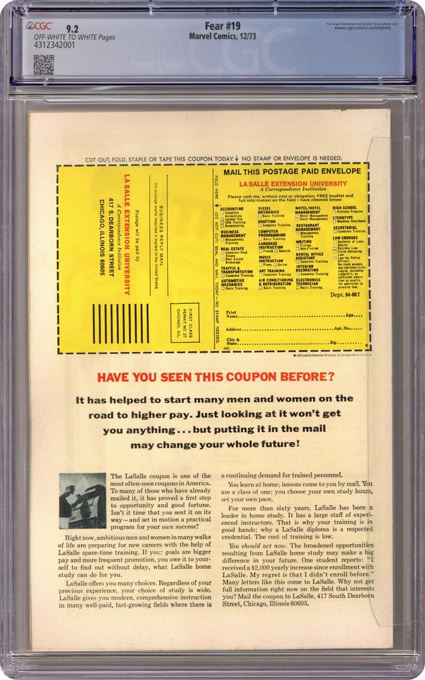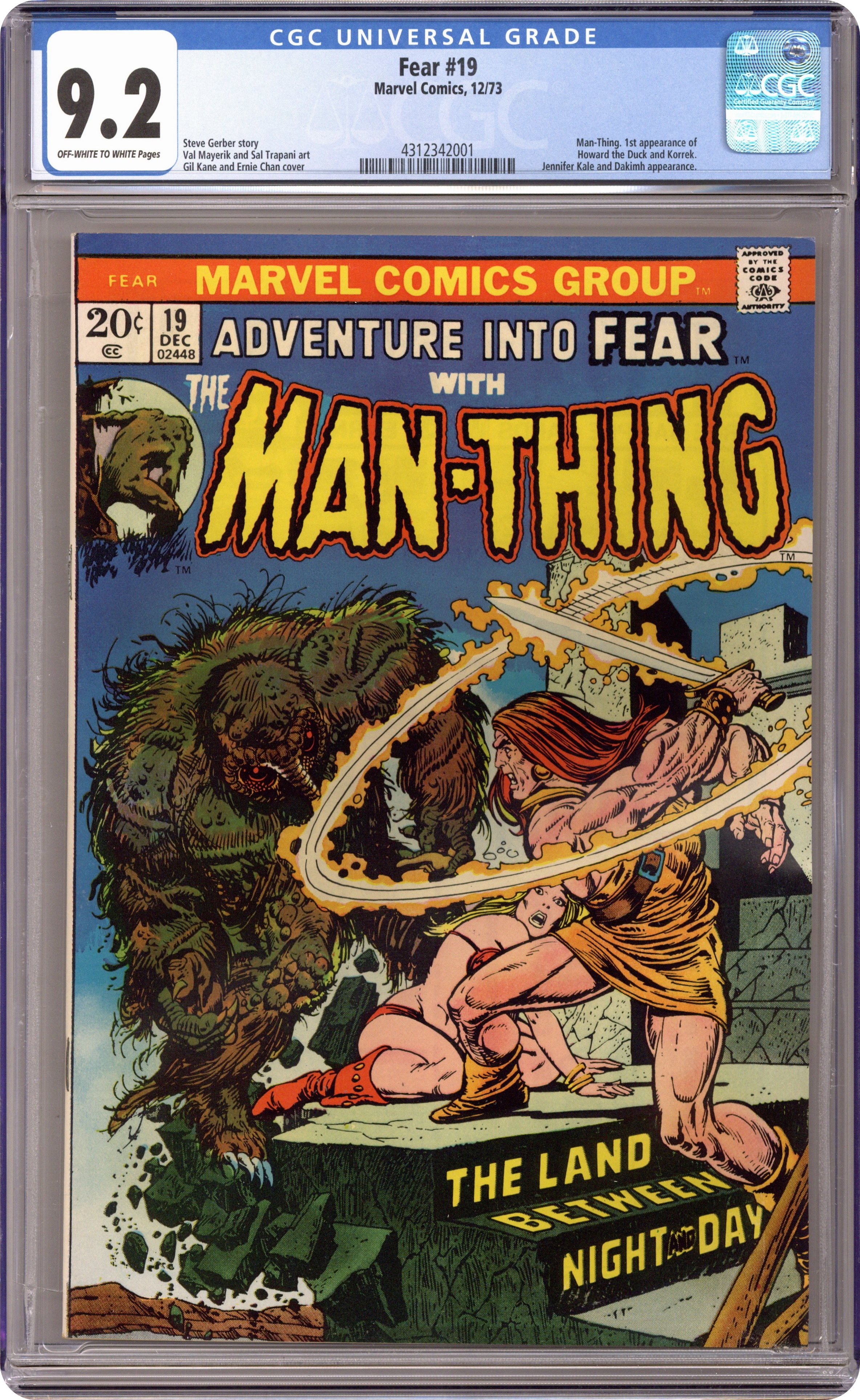 Ended Oct 16 2023 Winning Bid $255 1st appearance of Howard the Duck - Cover pencils by Gil Kane, inks by Ernie Chan. "The Enchanter's Apprentice!", script by Steve Gerber, pencils by Val Mayerik, inks by Sal Trapani; As an improbable battle rages on below the castle, Man-Thing is picked up by Jennifer Kale, with the savage Korrek following from behind; Korrek catches up with Kale and the Man-Thing and attacks the two of them; Jennifer suddenly awakens screaming, and as her brother and grandfather burst into the room to reassure her it's all a dream; However, Joshua Kale has his doubts that his granddaughters nightmares being just dreams; His suspicions are validated when Korrek is transported to Earth's dimension through a jar of peanut butter and resumes his attack on Jennifer; However, when Joshua and Andy burst into the room, Korrek believes himself surrounded and flees into the swamp; The Kales are soon visited by Dahkim the Mystic who has come to tell the Kales about the disruption in the Nexus of Realities caused by the construction being done in the swamp; Korrek is visited by Howard the Duck, who has also found himself transported to Earth's dimension as well. Man-Thing stories continue in Man-Thing #1. 36 pgs., full color. Cover price $0.20. Grade: CGC 9.2 explanation of grade Condition: Used (collectible)