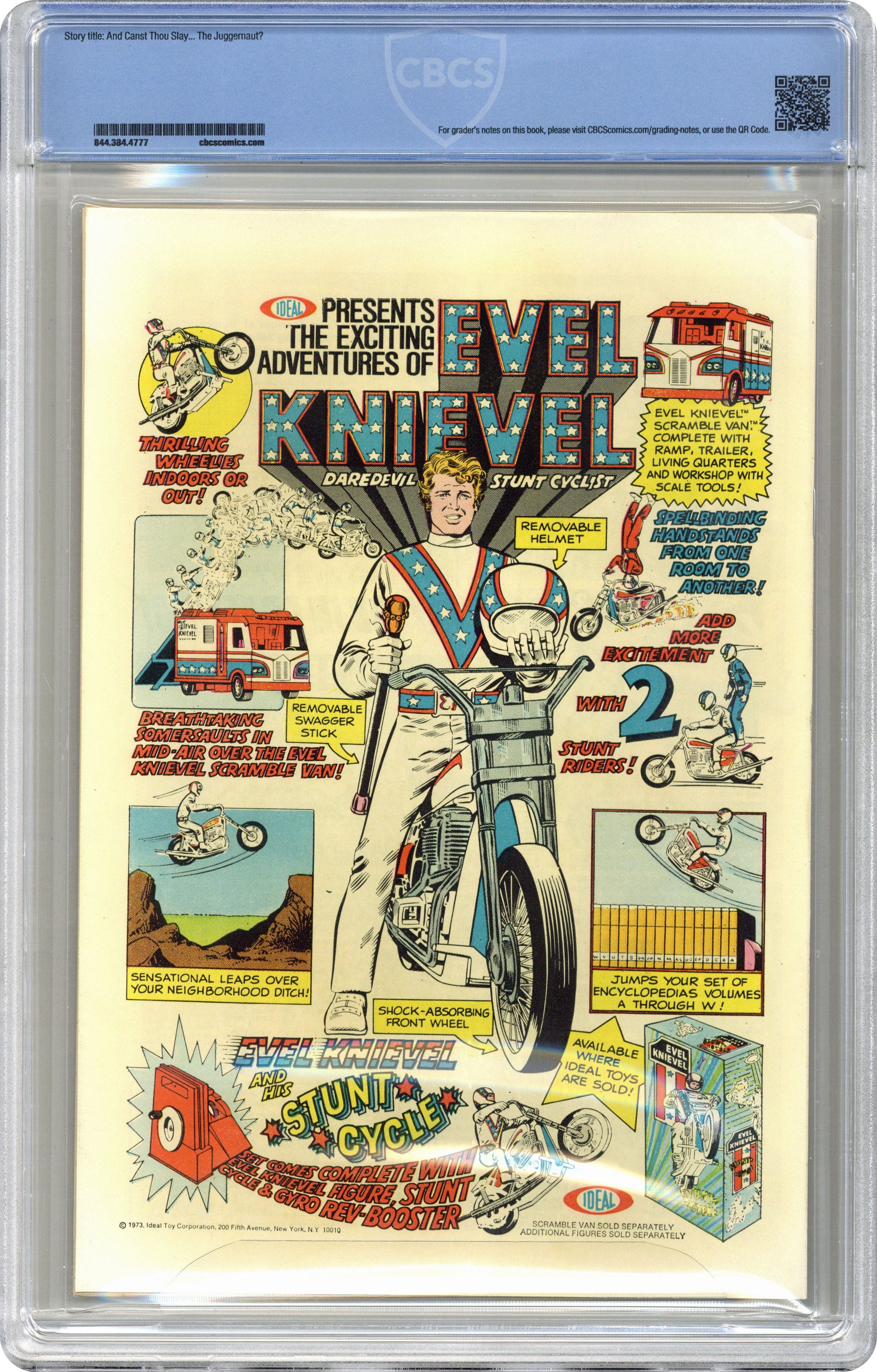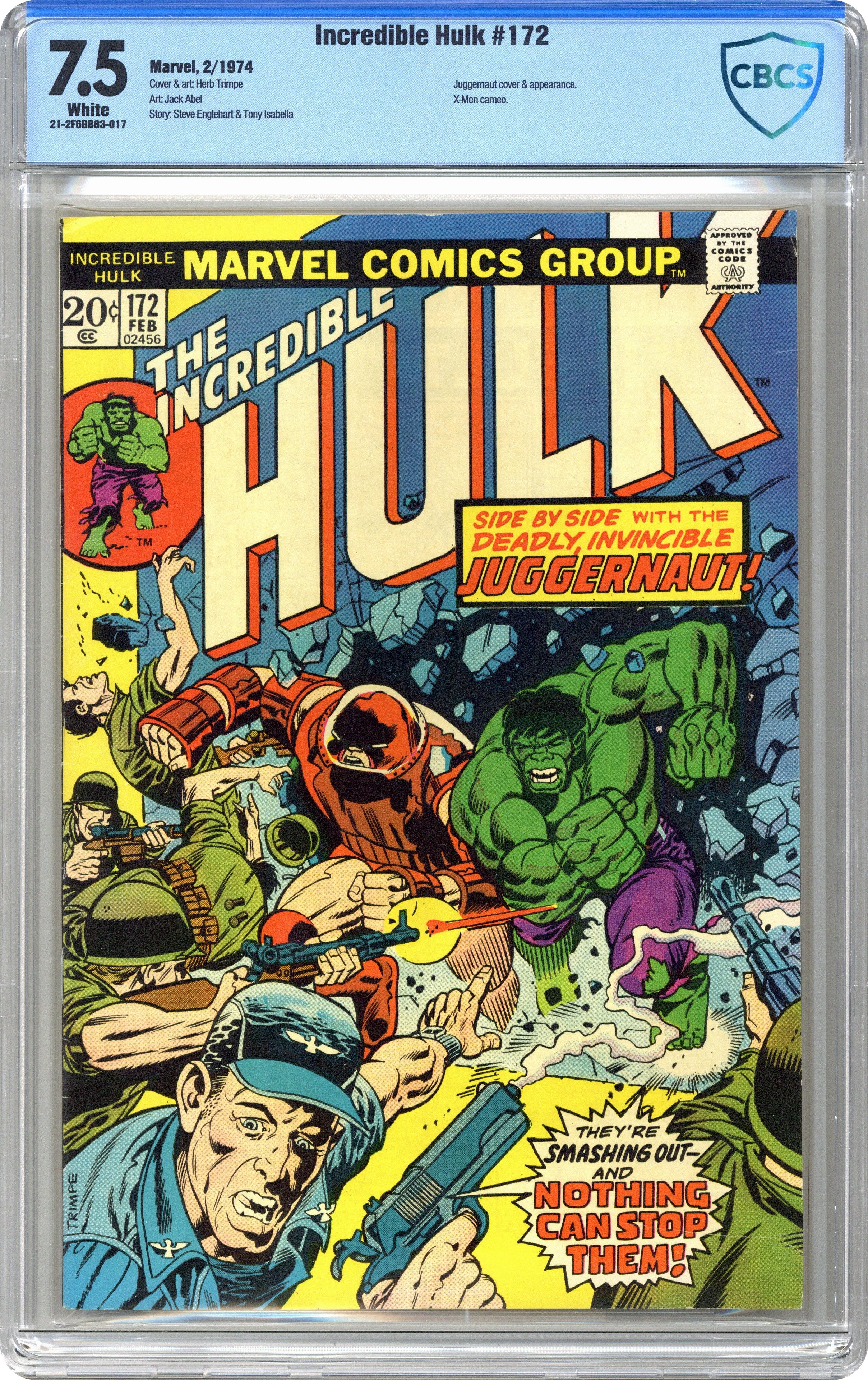 Cover art by Herb Trimpe. And Canst Thou Slay... the Juggernaut?, script by Steve Englehart (plot) and Tony Isabella (script), pencils by Herb Trimpe, inks by Jack Abel; Hulk has been captured and put in a holding cell at Hulkbuster base; As he is quickly dismantling the walls of his prison, Armbruster calls on Peter Corbeau who brings a ray to teleport the Hulk to another dimension; Hulk is blasted away but the Hulkbusters find themselves facing the Juggernaut in his place; When they try to use the ray again, the Hulk returns as well and the two powerhouses quickly bust out and get away; Hulk quickly finds he does not like his new ally and the two battle; The X-Men show up to capture Juggernaut but allow the Hulk to escape. Appearances by the X-Men (Professor X, Cyclops, and Marvel Girl in a crossover with Avengers 111), plus cameos by Doctor Strange, the Angel, the Beast, and Iceman. 36 pgs. $0.20. Cover price $0.20. Grade: CBCS 7.5 explanation of grade Condition: Used (collectible)
