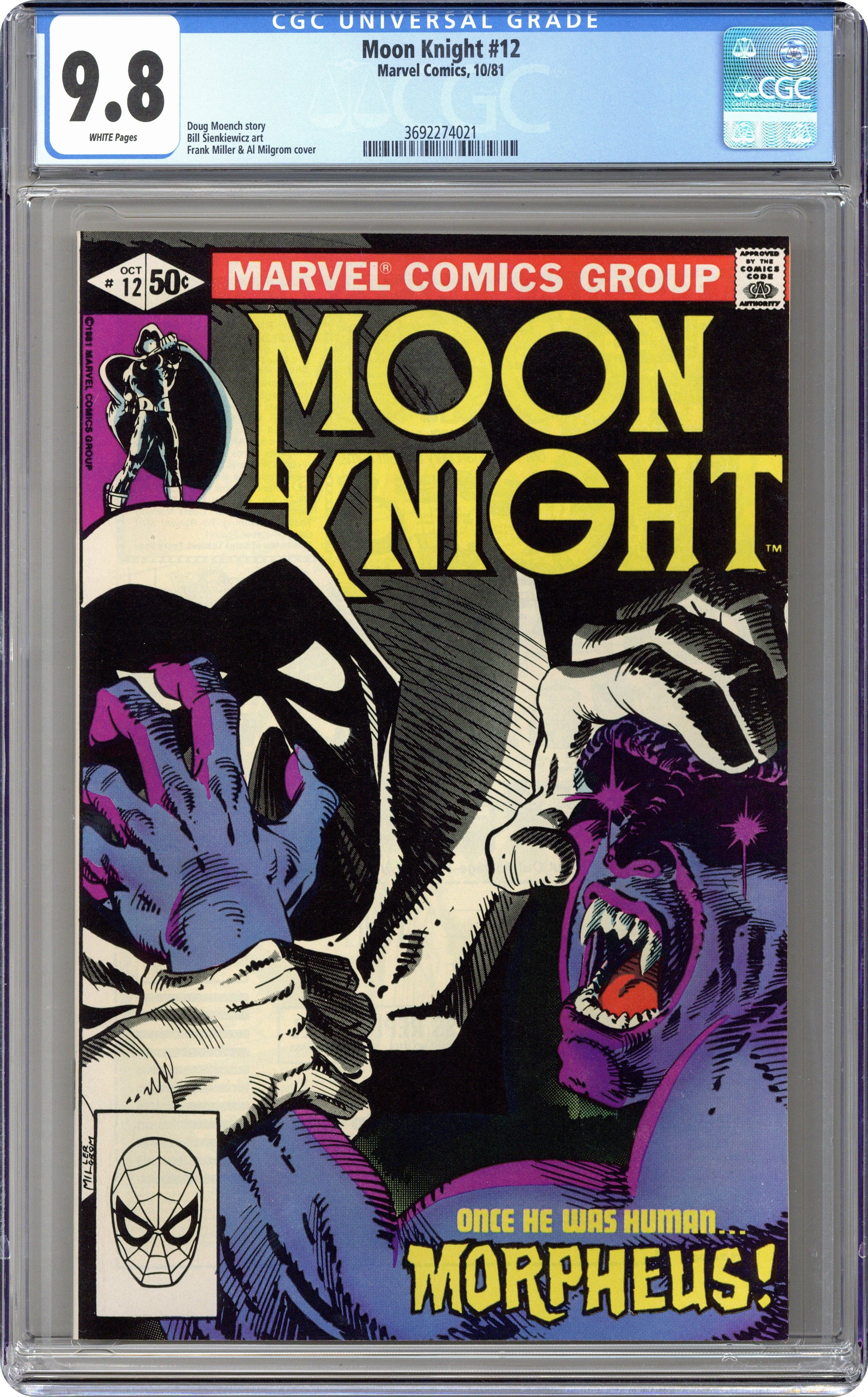 Ended Oct 17 2023 Winning Bid $55 "The Nightmare of Morpheus!" Written by Doug Moench, with art by Bill Sienkiewicz. Cover by Frank Miller and Al Milgrom. Marlene's brother is put into a coma by one of his psychiatric patients who gained super powers when he lost the ability to dream during sleep; Moon Knight tries to stop the monstrous villain before he can return to finish off the good doctor. 32 pages, FC. Cover price $0.50. Grade: CGC 9.8 explanation of grade Condition: Used (collectible)