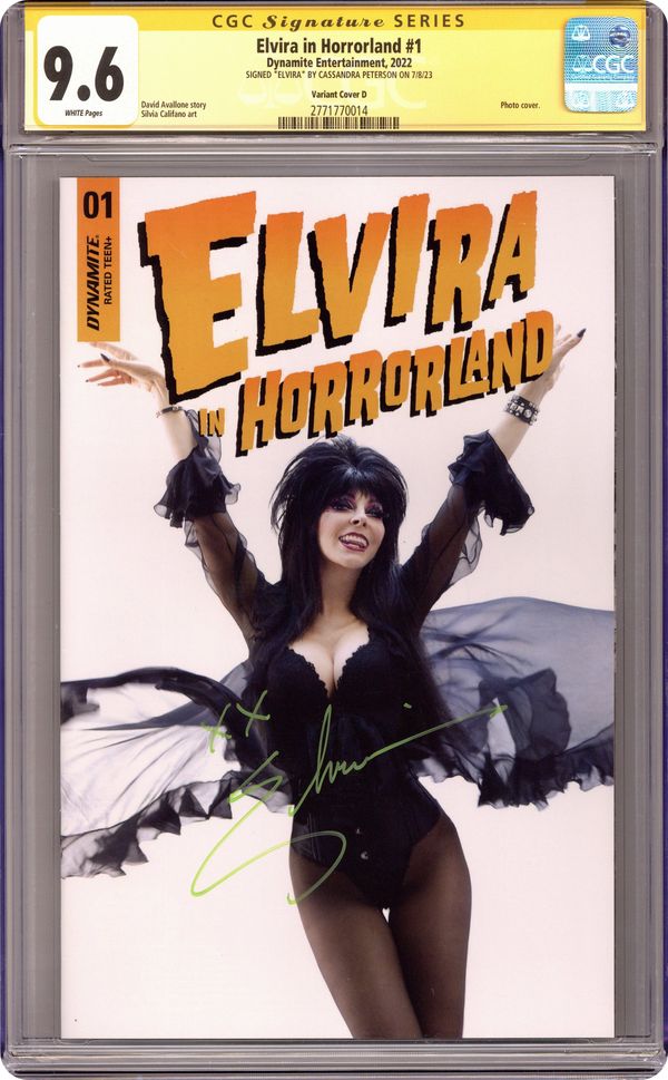 Published May 2022 by Dynamite Entertainment.Elvira in Horrorland (2022 Dynamite) 1D CGC 9.6 SS Cassandra Peterson Photo Variant