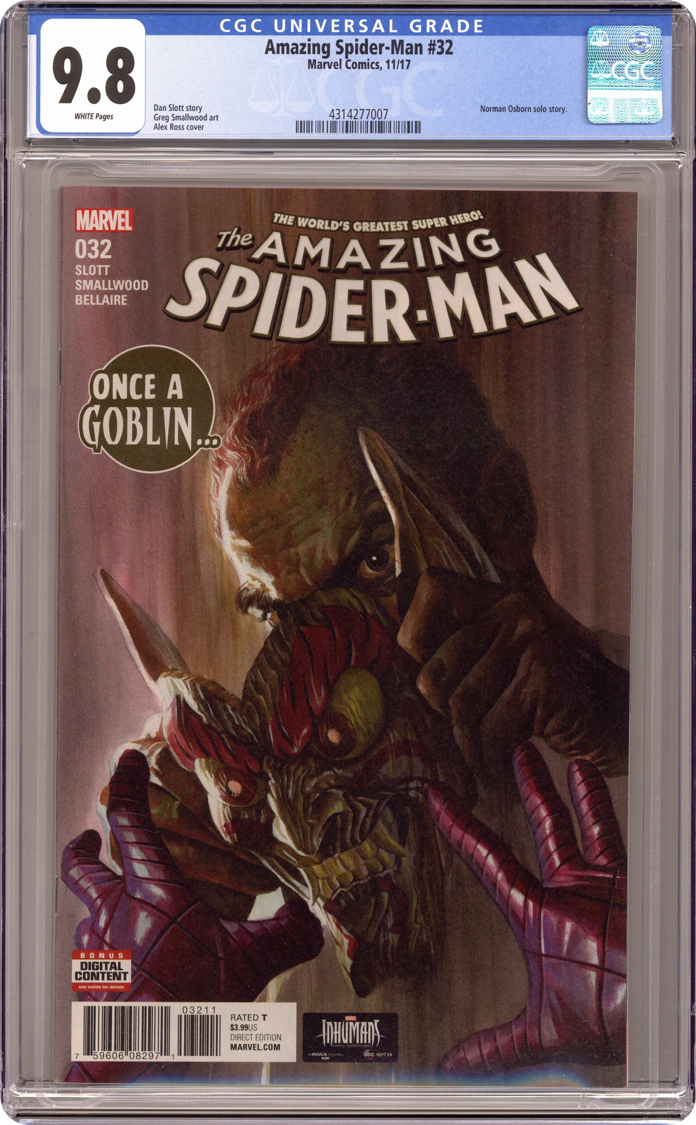 Ended Oct 14 2023 Winning Bid $24 Written by Dan Slott. Art by Greg Smallwood. Cover by Alex Ross. Norman Osborn's goblin-free battle with Spidey didn't go the way he had hoped… Now, Osborn needs to find an edge and get the Goblin back, and neither you nor Spidey are ready for the edge he's going to find! Guest artist Greg Smallwood (MOON KNIGHT) joins Dan Slott for this special issue that sets off the AMAZING SPIDER-MAN event of 2018! 36 pages, full color. Rated T Cover price $3.99. Grade: CGC 9.8 explanation of grade Condition: Used (collectible)