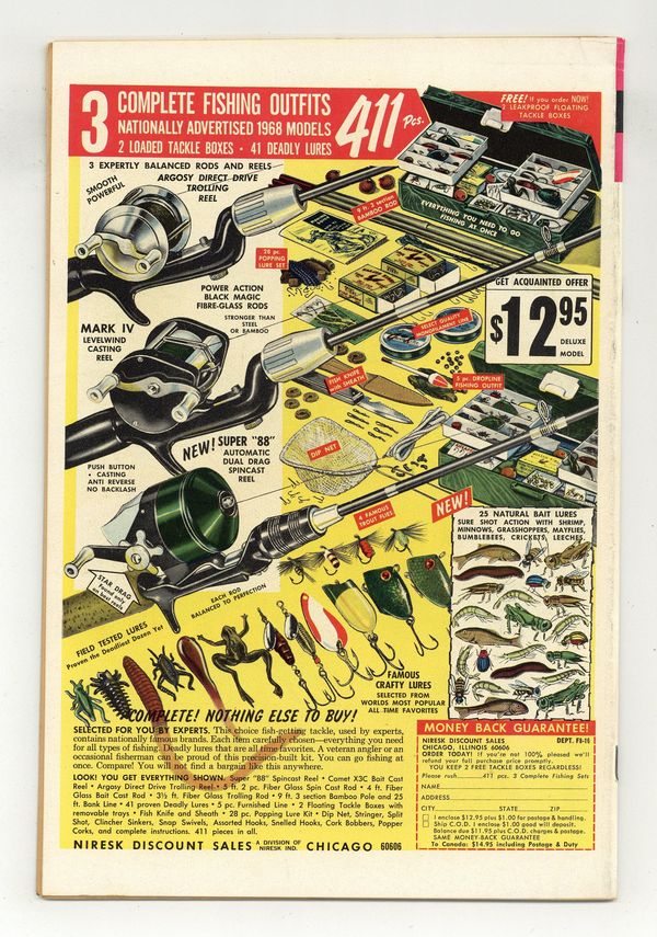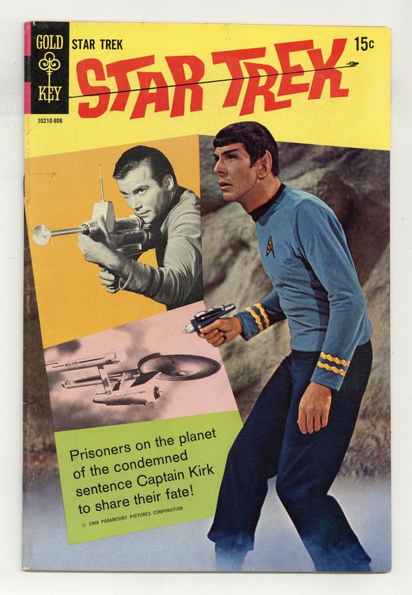 15 Cent Cover Price Variant with ad on back cover. Comic book version of the original Star Trek TV series that starred William Shatner and Leonard Nimoy. Photo cover of Leonard Nimoy & William Shatner. Photo of William Shatner, Leonard Nimoy, & DeForest Kelly on inside front cover. There are 2 versions of this comic. This version has an ad on the back cover. The other version has a photo back cover. "Part I: The Devil's Isle of Space," script by Dick Wood, art by Nevio Zeccara; Kirk and his landing party lands on an asteroid only to find it is inhabited by condemned convicts awaiting an unusual execution. "Part II: The Secret of... Execution Asteroid," script by Dick Wood, art by Nevio Zeccara; The asteroids are unstable and explode at random times; Once Kirk and his team is captured their fates seemed sealed. 36 pgs., full color. $0.15. Cover price $0.15. Grade: FN- 5.5 explanation of grade Condition: Used (collectible)