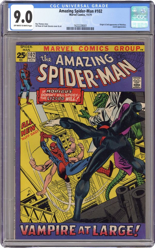 "Vampire at Large!" Double-Sized issue. Script by Roy Thomas. Pencils by Gil Kane. Inks by Frank Giacoia. Cover by Gil Kane and Frank Giacoia. The Amazing Spider-Man is on the ropes against the Living Vampire! The web-slinger (with his six arms) needs a miracle to survive the fangs of Morbius! And shockingly, he gets one -- that's crazy, green, and covered in scales: the Lethal Lizard! After a wild free-for-all, the wall-crawler and the Lizard drive Morbius out of Dr. Connors' summer home on Long Island. But they can't let the Living Vampire roam around New York City unchecked. Plus, the unlikely allies need a sample of Morbius' blood -- for the serum that might remove Peter Parker's extra arms! Wow, is this mission impossible for your friendly neighborhood Spider-Man? Good luck to the web-spinner and the Lizard too! Origin of Morbius. Cameo appearances by Gwen Stacy, Aunt May, J. Jonah Jameson, and Joe Robertson. Flashback cameos by Martine Bancroft and Emil Nikos. (Notes: Morbius appears next in Marvel Team-Up #3. Morbius' name is misspelled on the cover. This issue was reprinted in Marvel Tales 253.) 52 pages. Cover price $0.25. Grade: CGC 9.0 explanation of grade Condition: Used (collectible)