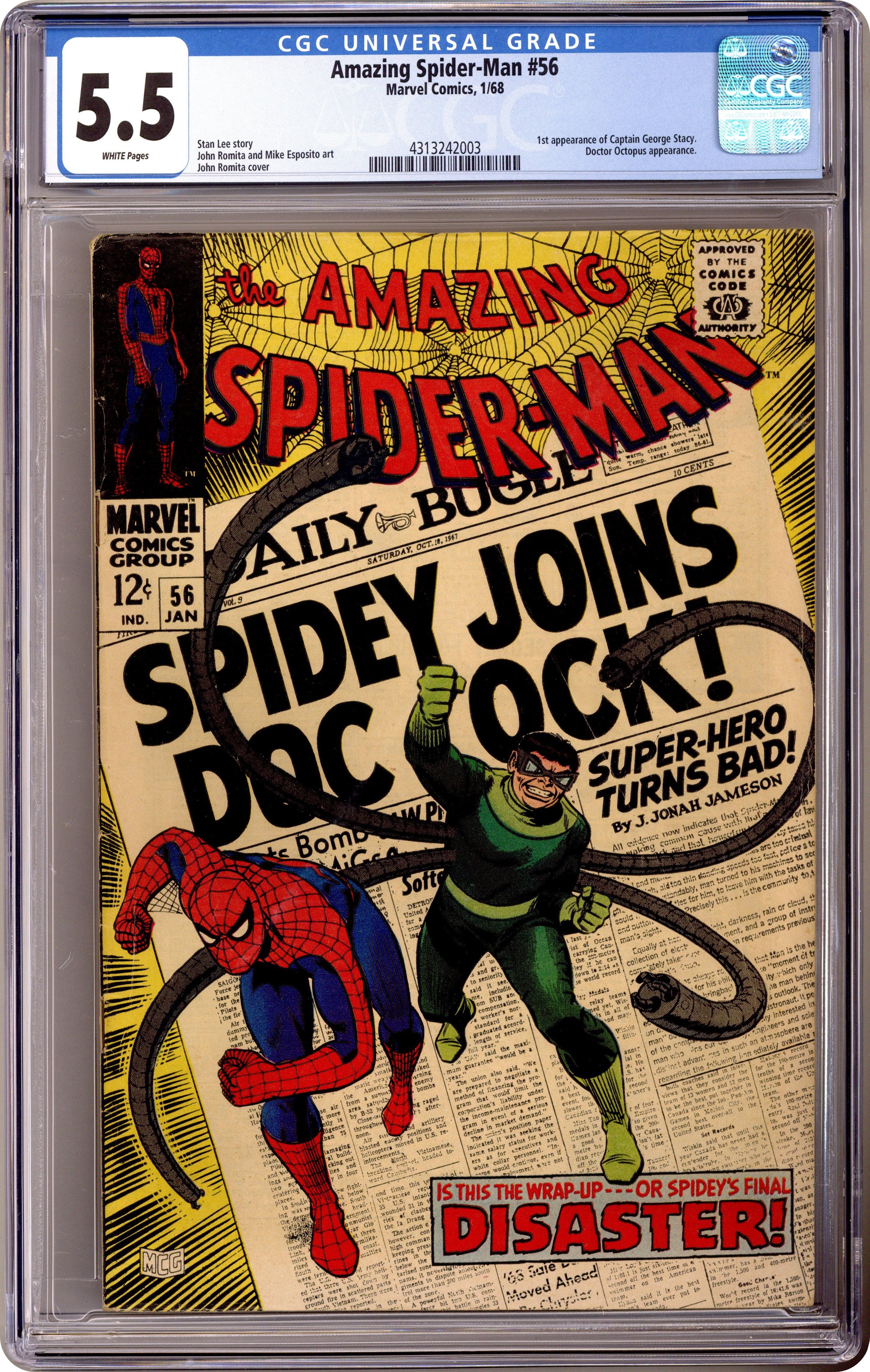 Ended Dec 4 2023 Winning Bid $89 Doctor Octopus appearance and the first appearance of Capt. Stacy in "Disaster" script by Stan Lee, pencils by John Romita Sr., inks by Mike Esposito as "Mickey Demeo." Spidey has amnesia, and Doc Ock convinces him that they are partners! Will he fall for it? Or just go along until his memory comes back? Romita cover. Reprinted in Marvel Tales # 41. 36 pgs. Cover price $0.12. Grade: CGC 5.5 explanation of grade Condition: Used (collectible)