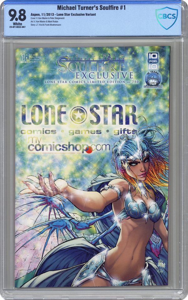 Ended Jun 22 2024 Winning Bid $21 Lone Star Exclusive Variant Cover. Written by J. T. Krul. Art by V Kenneth Marion.Aspen's final '10 for 10' series makes its red-hot debut! In the future, technology is everywhere, but there's a greater source of power and wonder now out there - magic! After saving the world from the destructive force of chaos itself, Malikai and his friends try to return to a life of normalcy. PJ is determined to be Benoist's heir in the battle arena, where cybernetic technology rules the day. Malikai is just happy to be with Sonia again, yet he can't help see that Grace is still haunted by the scars of the past. Meanwhile, a secret danger grows in the shadows between magic and technology, and it has a name - RAINIER! Don't miss this exciting premiere issue of the ALL NEW SOULFIRE! Join veteran Soulfire scribe JT Krul, along with the amazing artistic talents of V. Ken Marion and Kyle Ritter, as an all-new direction for Michael Turner's fantasy epic Soulfire begins right now! Grade: CBCS 9.8 explanation of grade Condition: Used (collectible)