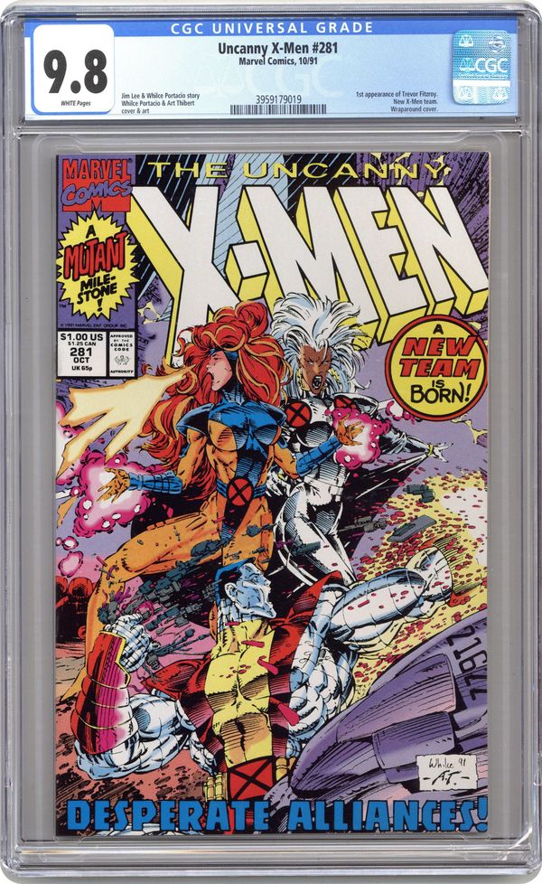 FIRST PRINTING with WHITE title logo (second printing has a red title logo). "Fresh Upstart!" Story by Jim Lee, Whilce Portacio, and John Byrne. Art by Whilce Portacio and Art Thibert. It's a new era for Marvel's Merry Mutants. Xavier's original students have returned home and reunited with the X-Men to assemble the greatest team of super-human mutants ever assembled. But with new a new team comes new threats. Who are the Upstarts and what kind of threat do they pose to the X-Men, and mutantkind in general? Witness the ultimate fate of Donald Pierce, the Reavers, the White Queen and her Hellions. NOTE: 1st appearance of Fitzroy. ****death of Donald Pierce, the Reavers, Jetstream, Beef, and Tarot. 1st printing - white title. 36 pgs. Cover price $1.00. Grade: CGC 9.8 explanation of grade Condition: Used (collectible)