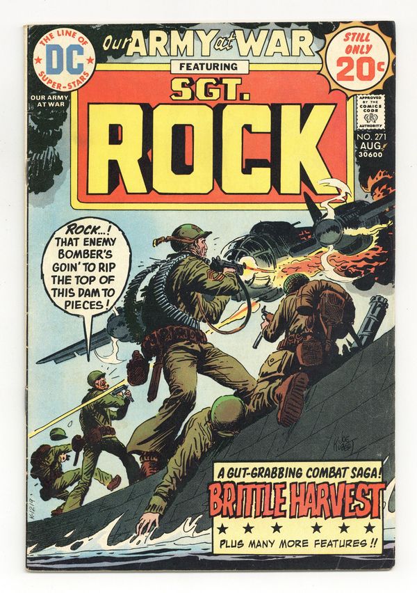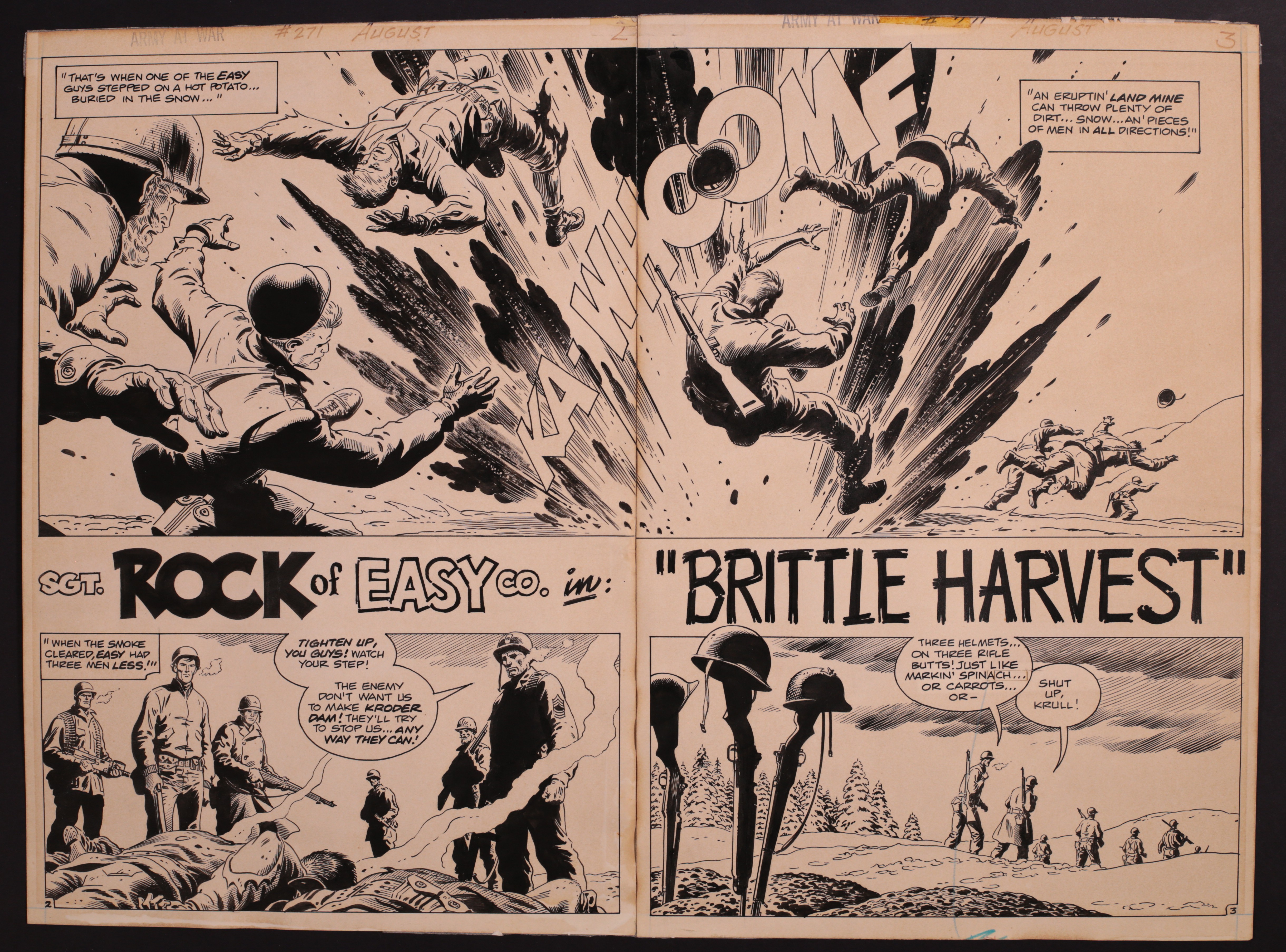 A powerful, dynamic spread from comics legend Russ Heath that delivers on everything that makes Our Army at War so special in the way it was able to combine both exciting action and the toll war takes on a soul. The beautifully drawn explosion gives way to two melancholy panels- including the iconic helmets on rifle butts as grave markers -before Easy Company presses forward with their mission.