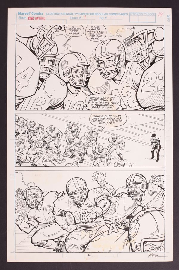 College football team The New York Knights prepare to make their final charge to win the game as quarterback and team captain Arthur King leads the team to victory. A fantastic football action page, with great figure work and solid inking by Stein. Pencil and ink on Marvel Comics art board. 11" x 17". NOTE: Page is missing two word balloons (one from first panel, one from third panel) and lettering stats from from the third panel.