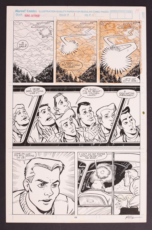 Weather is the least of the New York Knights' concerns as the team notices (in a great widescreen panel of the full main cast) that their bus is being pursued by a mysterious light! Signed by Wilson in bottom right corner. Pencil and ink on Marvel Comics art board. 11" x 17". NOTE: Panels 2 and 3 are pasted-in stat images.