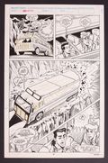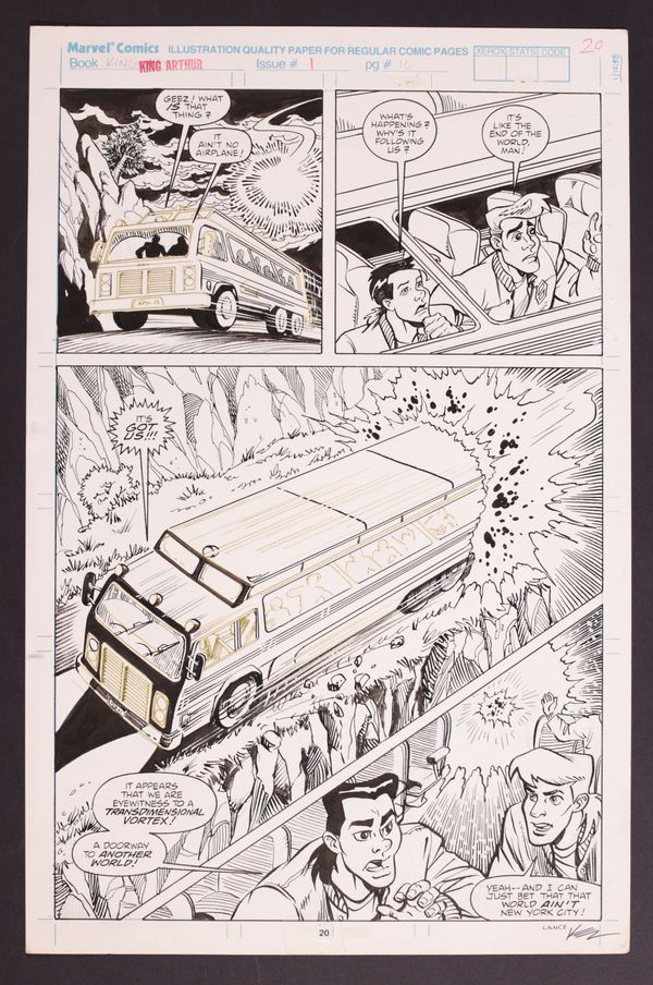 An absolutely beautifully drawn page that shows the New York Knights' bus being sucked into a mysterious portal- complete with a sprinkling of Kirby Krackle! Signed by Wilson in bottom right corner. Pencil and ink on Marvel Comics art board. 11" x 17".