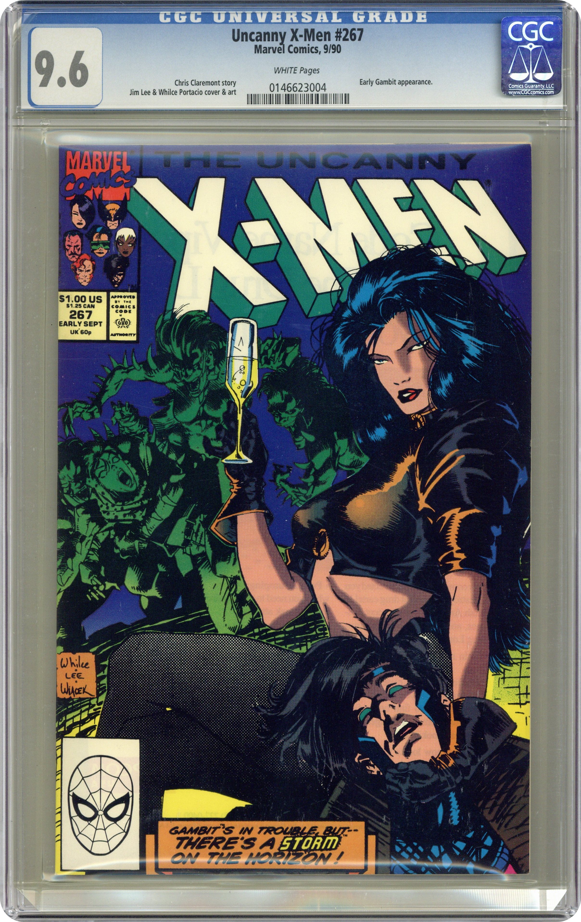 "Nanny!" Part 3 of 3. Story by Chris Claremont. Art by Whilce Portacio, Jim Lee, and Scott Williams. Cover by Whilce Portacio, Jim Lee, and Bob Wiacek. Not only do Storm and Gambit have to deal with the murderous Hounds, but now Nanny and the Orphan Maker decide to get involved as well. Can these world class thieves manage to escape this two-pronged attack? 36 pgs. Cover price $1.00. Grade: CGC 9.6 explanation of grade Condition: Used (collectible)