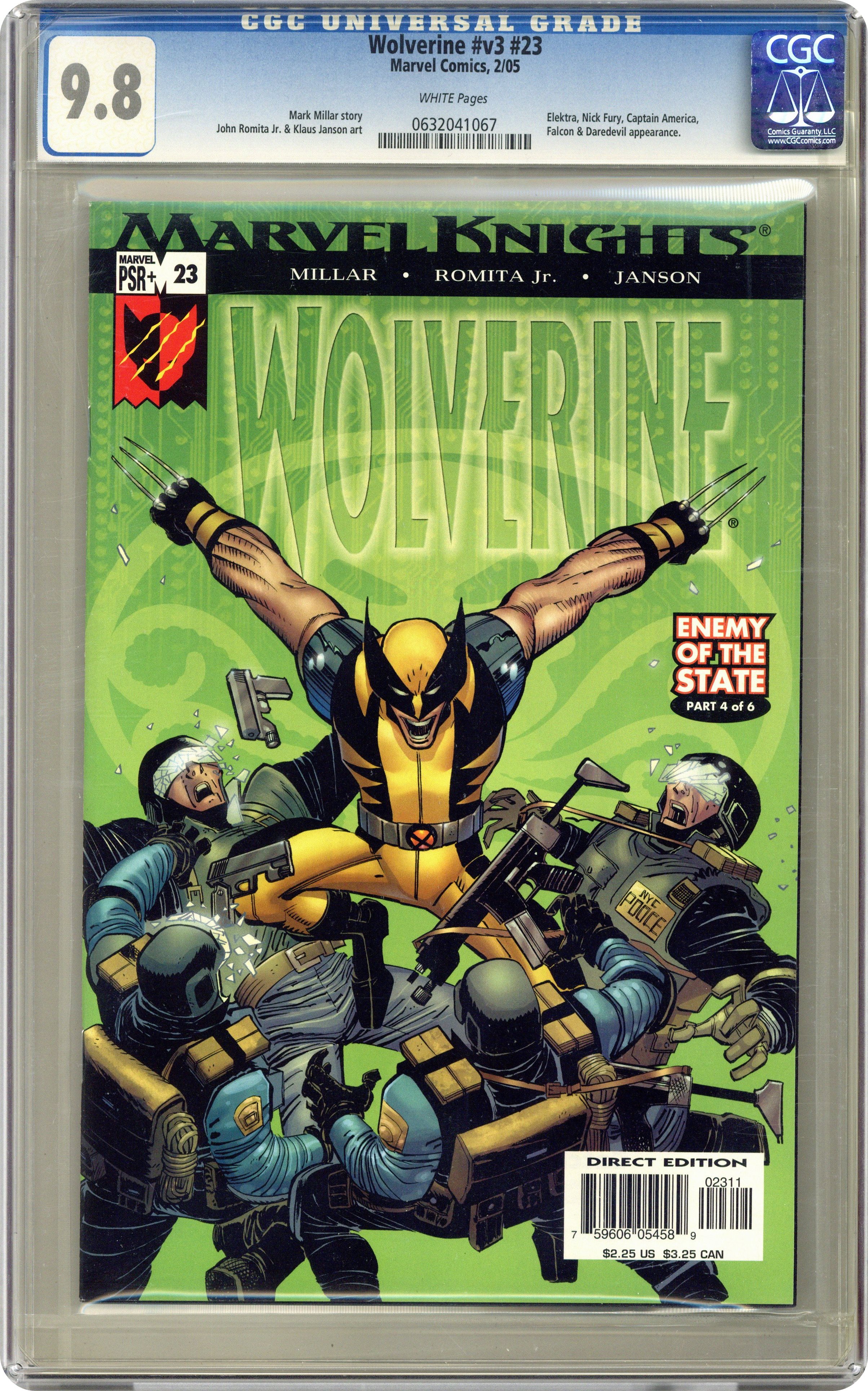 Ended Aug 19 2024 Winning Bid $20 ENEMY OF THE STATE: Part 4 of 6 - Written by Mark Millar Art & Cover by John Romita Jr. & KLAUS JANSON Brainwashed by the Hand, an evil Wolverine is wreaking havoc all over the country. Elektra's tracking his trail of destruction...and tracking her are a couple dozen Hand ninjas... Sitting back and watching with glee is Baron Wolfgang Von Strucker...whose work and personal lives are about to get a little too close for comfort, thanks to The Gorgon. 32 PGS./MARVEL PSR Cover price $2.25. Grade: CGC 9.8 explanation of grade Condition: Used (collectible)