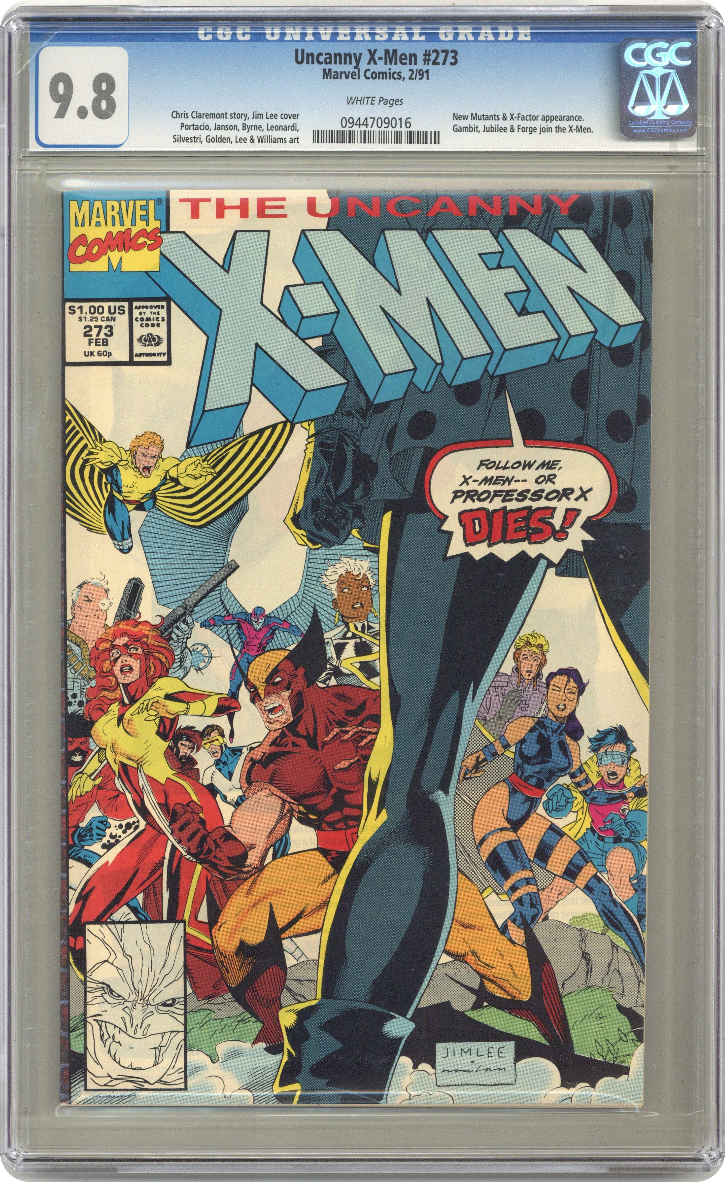 "Whose House is this Anyway?!" Guest-starring X-Factor and the New Mutants. Story by Chris Claremont. Cover by Jim Lee and Scott Williams. The halls of Xavier's Institute are becoming very crowed. This very special issue, featuring the talents of an army of the industry's best, answers the question "what happens when there too many mutants?" Plus, Lila Cheney arrives with dire news about Professor X! Featuring art by Whilce Portacio, Klaus Janson, John Byrne, Rick Leonardi, Marc Silvestri, Michael Golden, Larry Stroman, Jim Lee, and Scott Williams. 36 pgs. Cover price $1.00. Grade: CGC 9.8 explanation of grade Condition: Used (collectible)