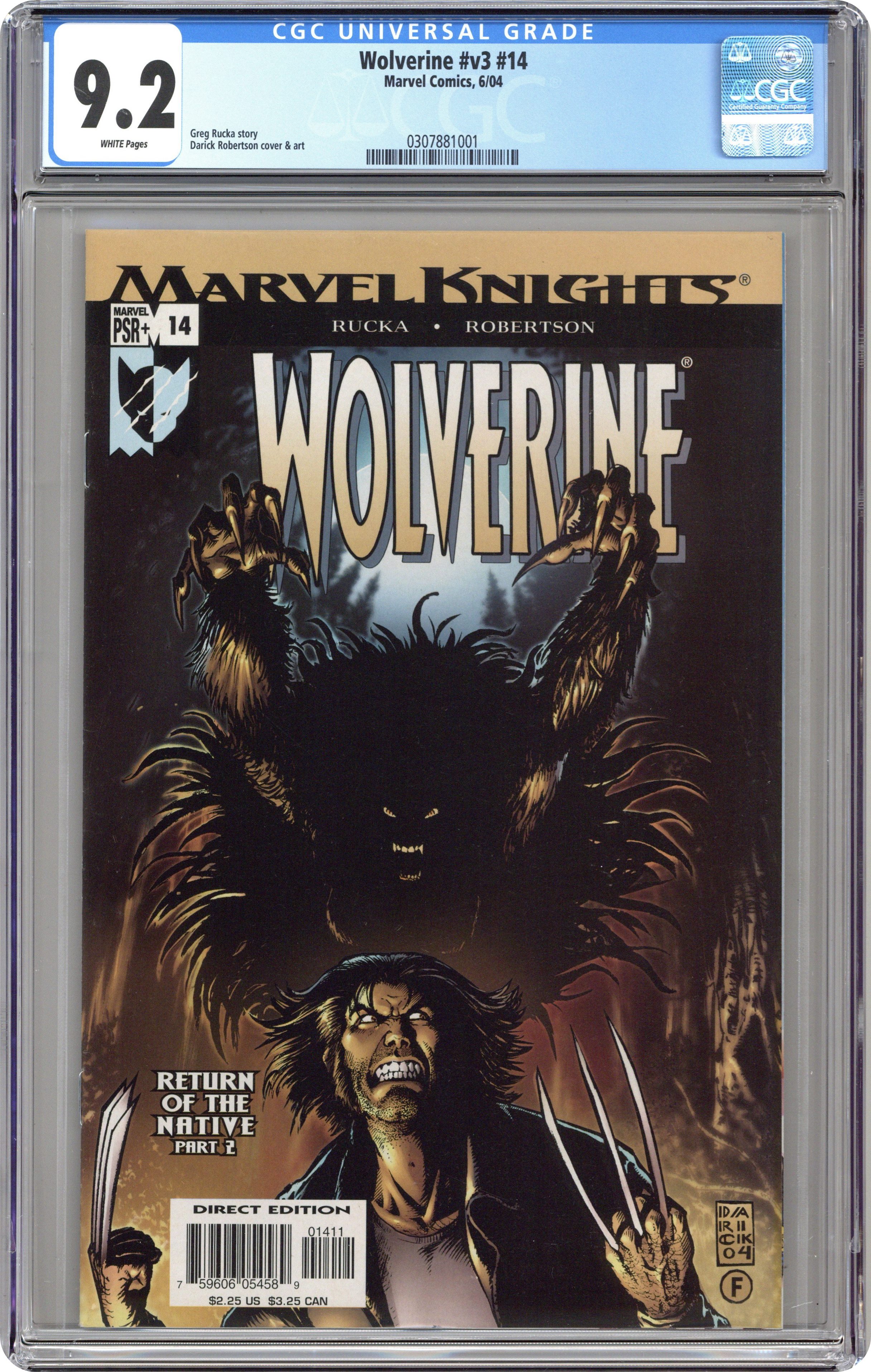 Ended Aug 28 2024 Winning Bid $11 WOLVERINE #14 Written by GREG RUCKA Covers & pencils by DARICK ROBERTSON "RETURN OF THE NATIVE": Parts 2 of 7?Somewhere in the Canadian Wilderness lurks the one that got away ? a creature even wilder than Logan. Sabretooth has located her, and he's got the scars to prove it. To bag this catch, however, he's going to need help ? Wolverine's! 32 PGS. (each)/MARVEL PSR+...$2.25 (each) Issue #13 UPC: 5960605458-01311; #14: 5960605458-01411 · NEW STORY ARC! TWO BIG MARVEL KNIGHTS ISSUES!! · FEATURING THE RETURN OF SABRETOOTH! Cover price $2.25. Grade: CGC 9.2 explanation of grade Condition: Used (collectible)