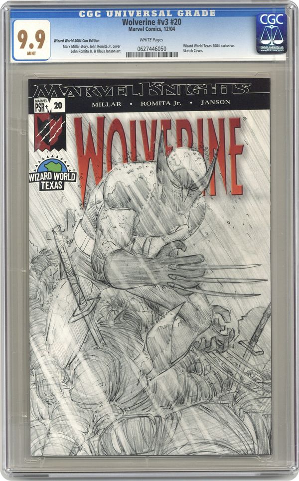 Wizard World Texas Sketch Variant. ENEMY OF THE STATE: Part 1 of 6 - Written by MARK MILLAR Pencils & Wraparound Cover by JOHN ROMITA JR. "ENEMY OF THE STATE" PART 1 of 6. The world's deadliest living weapon just fell into the wrong hands. It's Wolverine vs. the Marvel Universe in a blockbuster storyline that will have Logan shredding his way through the X-Men, Avengers, Fantastic Four, and S.H.I.E.L.D.! How does Wolverine end up fighting to destroy everything he holds dear? In this issue alone: Nick Fury, Elektra, Kitty Pryde, and a new villain you've got to see to believe! GET READY FOR THE RIDE OF YOUR LIFE! 32 PGS. (each) /MARVEL PSR+ ...$2.25 (each) ISSUE #20 UPC: 5960605458-02011; ISSUE #21 UPC: 5960605458-02111 Grade: CGC 9.9 explanation of grade Condition: Used (collectible)