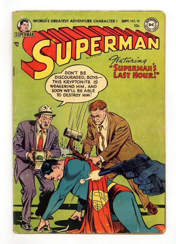 Cover art by Win Mortimer. The Impossible Headlines starring Superman, Jigger Benson, and George Earns (briefly edits the PLANET), pencils by Wayne Boring, inks by Stan Kaye. Superman's Sweetheart, script by Bill Woolfolk, art by Al Plastino; time-travel story. Little Pete humor two-pager by Henry Boltinoff. The Secret of Sam Trask's Pet text story. Superman's Last Hour starring Superman, Nails Harrigan, and Dan Delta, script by Jerry Coleman, art by Al Plastino. Full-page ad for Jimmy Olsen #1. 44 Pages, Full Color. Cover price $0.10. Grade: GD/VG 3.0 explanation of grade Condition: Used (collectible)