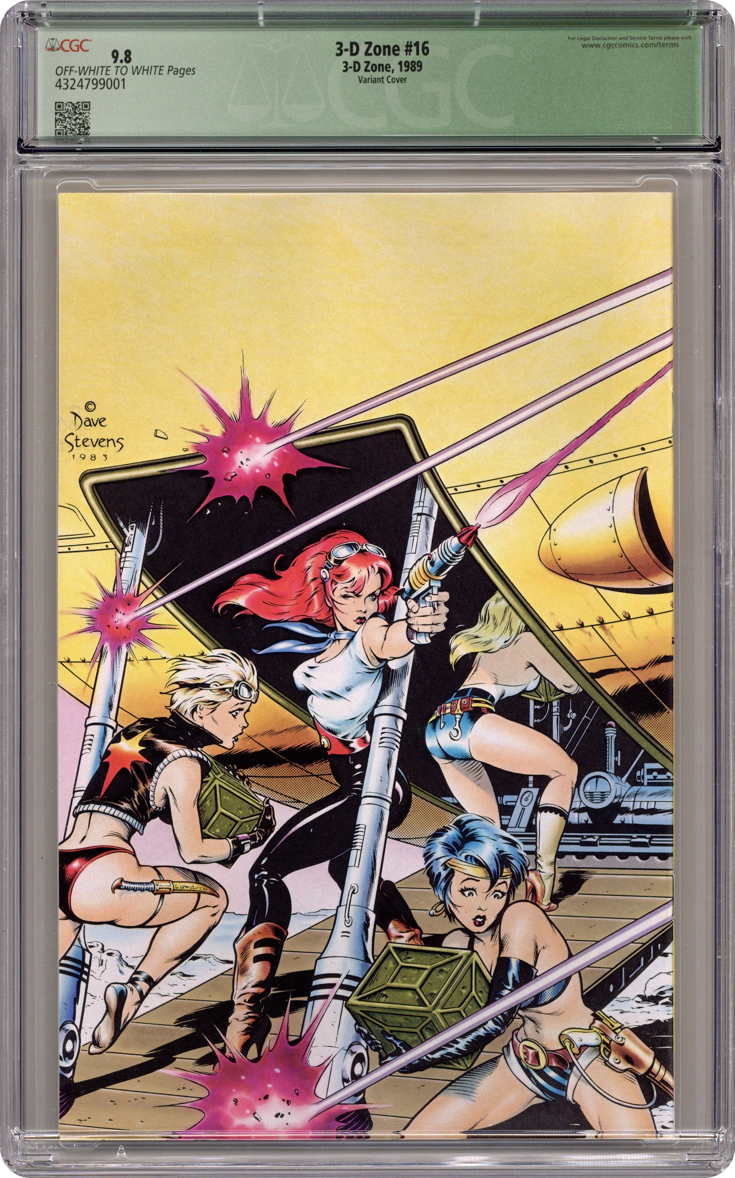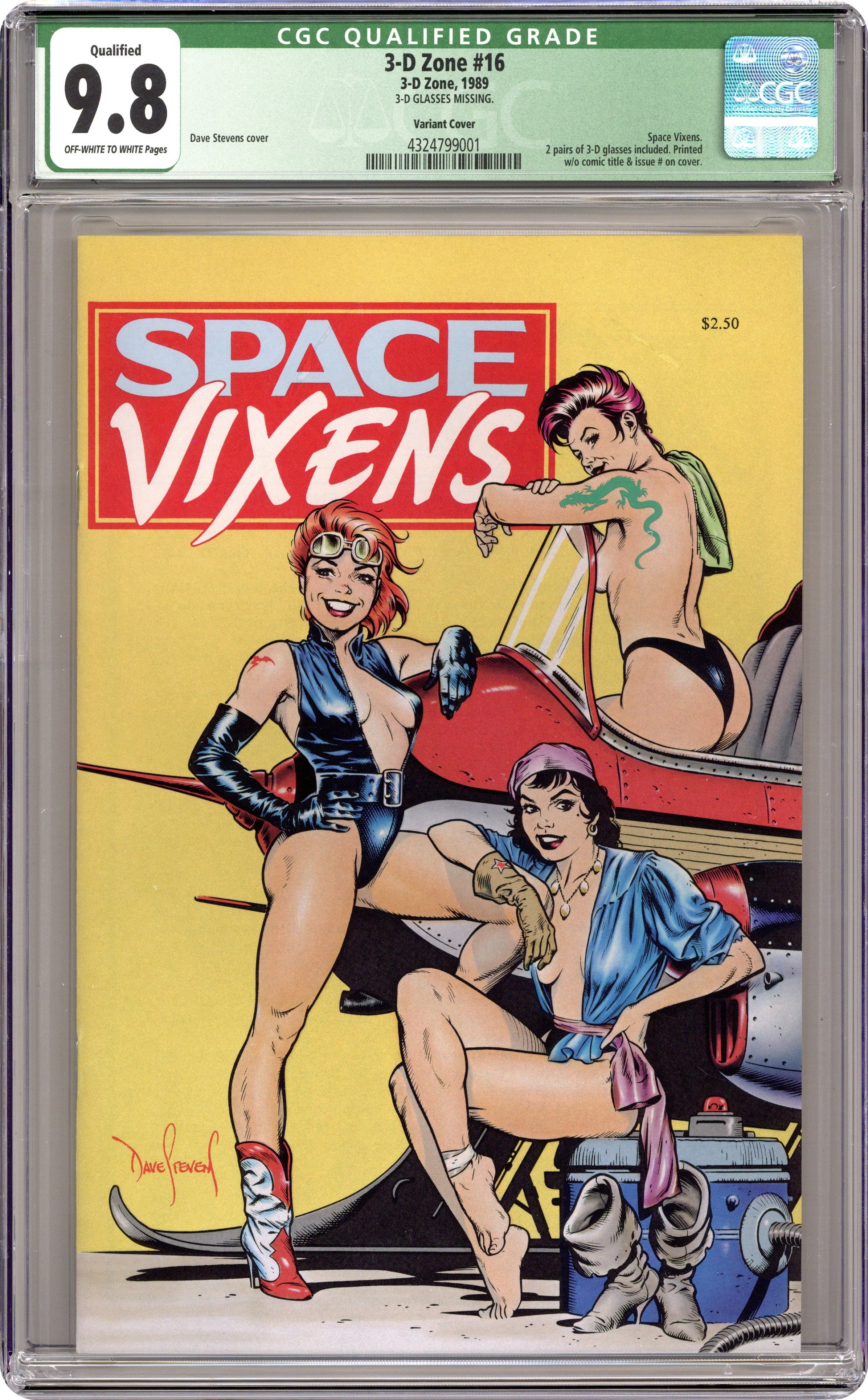 Minimal Trade Dress Variant Cover. #16 Space Vixens. Dave Stevens story and art. Bruce Jones script. These copies appear to have been distributed without 3-D glasses bound in. Cover price $2.50. Grade: CGC 9.8 explanation of grade Condition: Used (collectible)