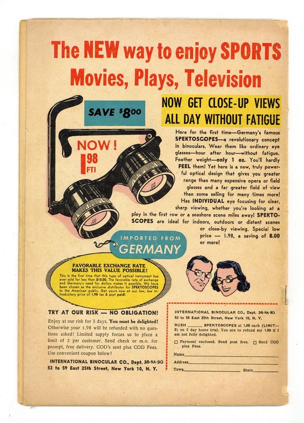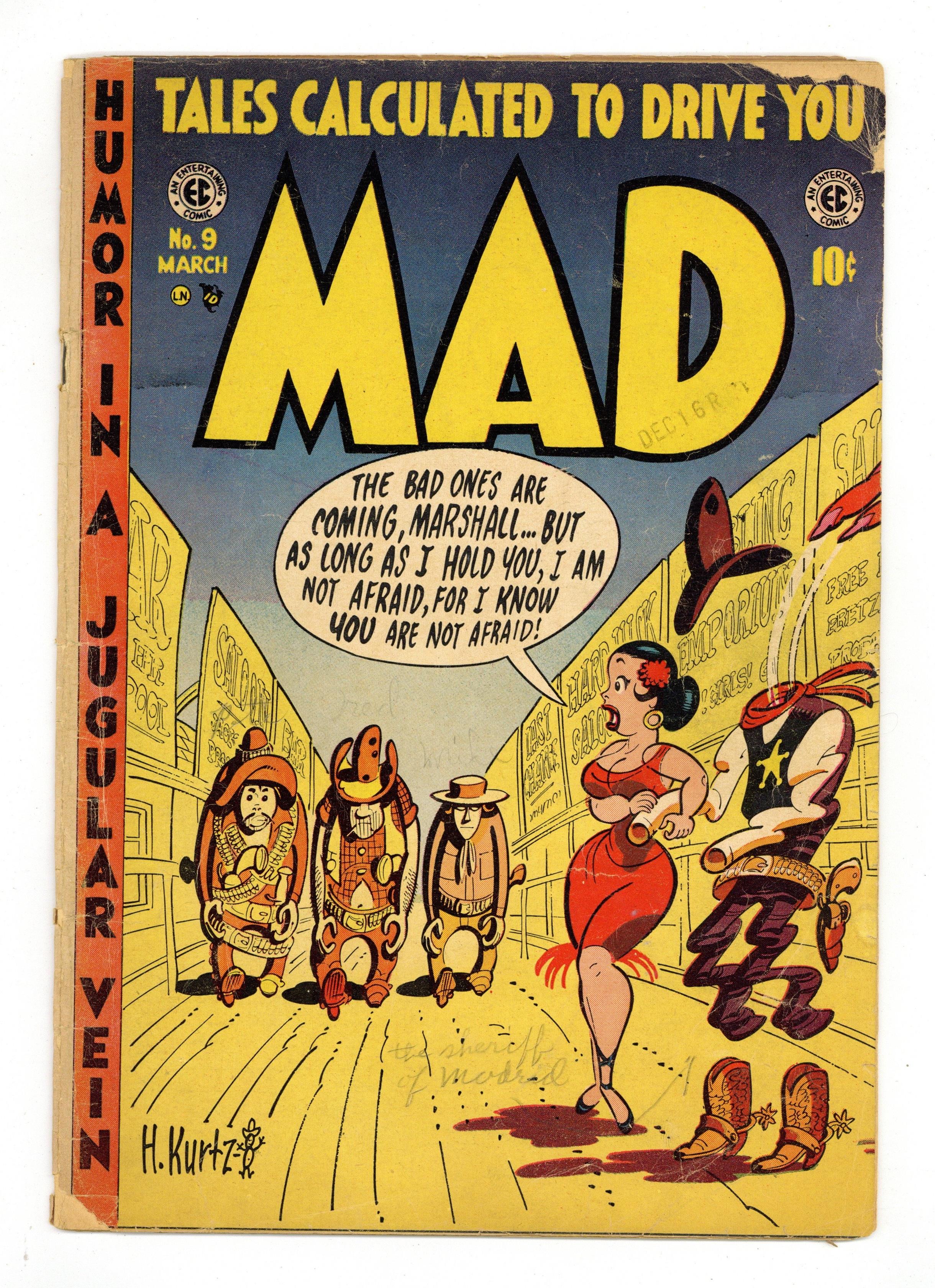 Cover by Harvey Kurtzman. E.C. Fan-Addict Club ad. "Little Orphan Melvin!", script by Harvey Kurtzman, art by Wally Wood; Daddy is continually too late to save Melvin from danger, and also cannot save himself from Mommy; Little Orphan Annie comic strip parody. "The Raven," script by Edgar Allan Poe, art by Bill Elder; An adaptation of Poe's poem "The Raven." Ad for Panic magazine. "Bop Jokes!", script by Harvey Kurtzman, art by John Severin; Five gags using Bop terms. "Operation Under-the-Ground" (Chapter 3) text story. "Hah! Noon!", script by Harvey Kurtzman, art by Jack Davis; Marshall Kane dithers about leaving town, beats up another marshall, and kills some accomplices of Miller before subduing Miller without violence; Parody of the Gary Cooper film "High Noon." 36 pgs., full color. $0.10. Cover price $0.10. Grade: GD/VG 3.0 explanation of grade Condition: Used (collectible)
