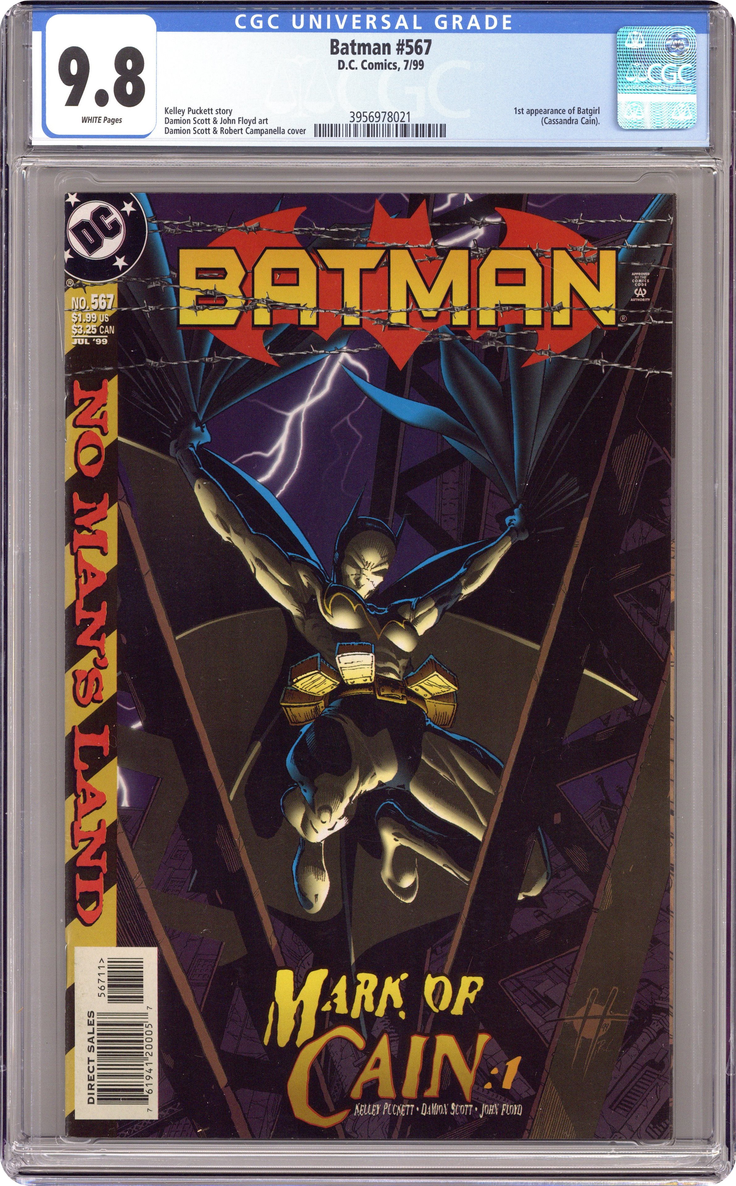 No Man's Land Part 23. Mark of Cain: Part 1 of 2. Continued in Detective Comics (1937-) #734. Written by Kelley Puckett. Art by Damion Scott and John Floyd. Cover by Damion Scott and Robert Campanella. A two-part story with dramatic implications for the new Batgirl begins! One of the world's deadliest assassins has been dispatched to No Man's Land to kill one of its denizens. And the only person that stands in his way is a mysterious, seemingly mute young female agent of Oracle, one who may have ties to the assassin himself! 36 Pages, Full Color. Cover price $1.99. Grade: CGC 9.8 explanation of grade Condition: Used (collectible)