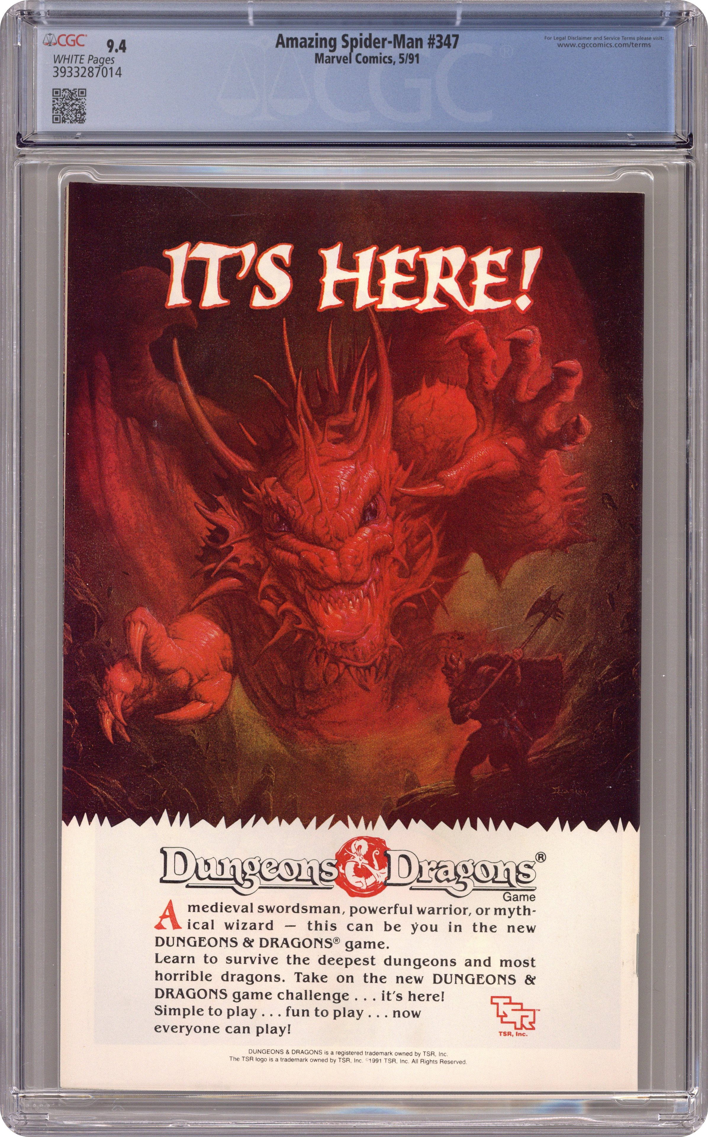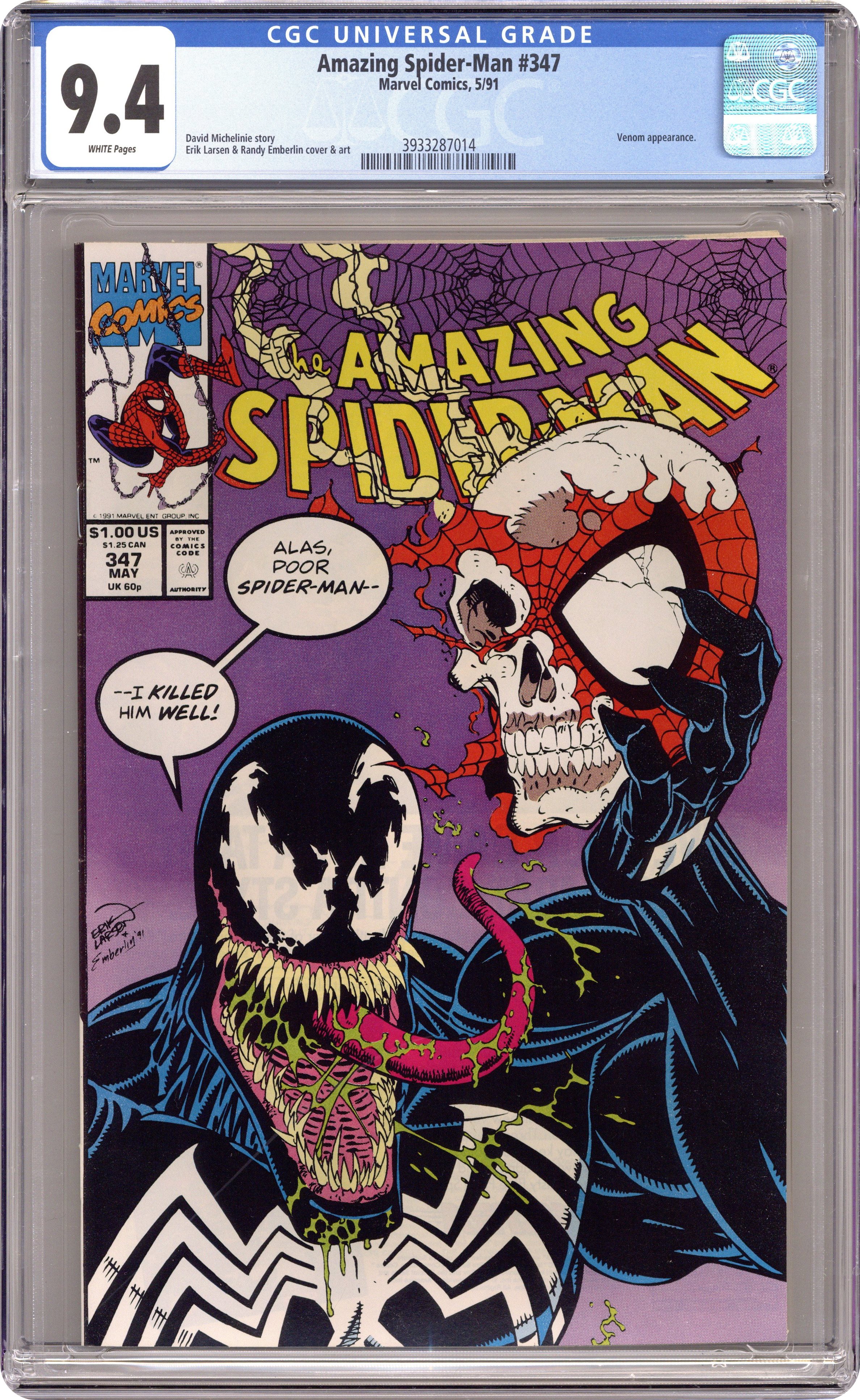 Direct Edition. "The Boneyard Hop!" Part 2 of 2. Script by David Michelinie. Pencils by Erik Larsen. Inks by Randy Emberlin. Cover by Erik Larsen and Randy Emberlin. On a deserted island, the Amazing Spider-Man wages a desperate battle for survival vs. the vicious Venom! The wall-crawler is fighting for his life! While Venom is fighting for his death! And this time there isn't any help or rescue on the way! As shown on the twisted cover, Venom plans to quote Hamlet once the battle is over! If the spectacular one doesn't want to play the part of Yorick; he better move fast! To thine own self be true, web-slinger! Cameo appearances by Mary Jane Watson, Willie Lumpkin, Aunt May, Flash Thompson, and the Black Cat. (Notes: Venom appears next in Darkhawk 13 & 14. This two-part story was reprinted in the trade paperbacks: Spider-Man: Venom Returns (1993) and Spider-Man: The Vengeance of Venom (2011).) 36 pages. Cover price $1.00. Cover price $1.00. Grade: CGC 9.4 explanation of grade Condition: Used (collectible)