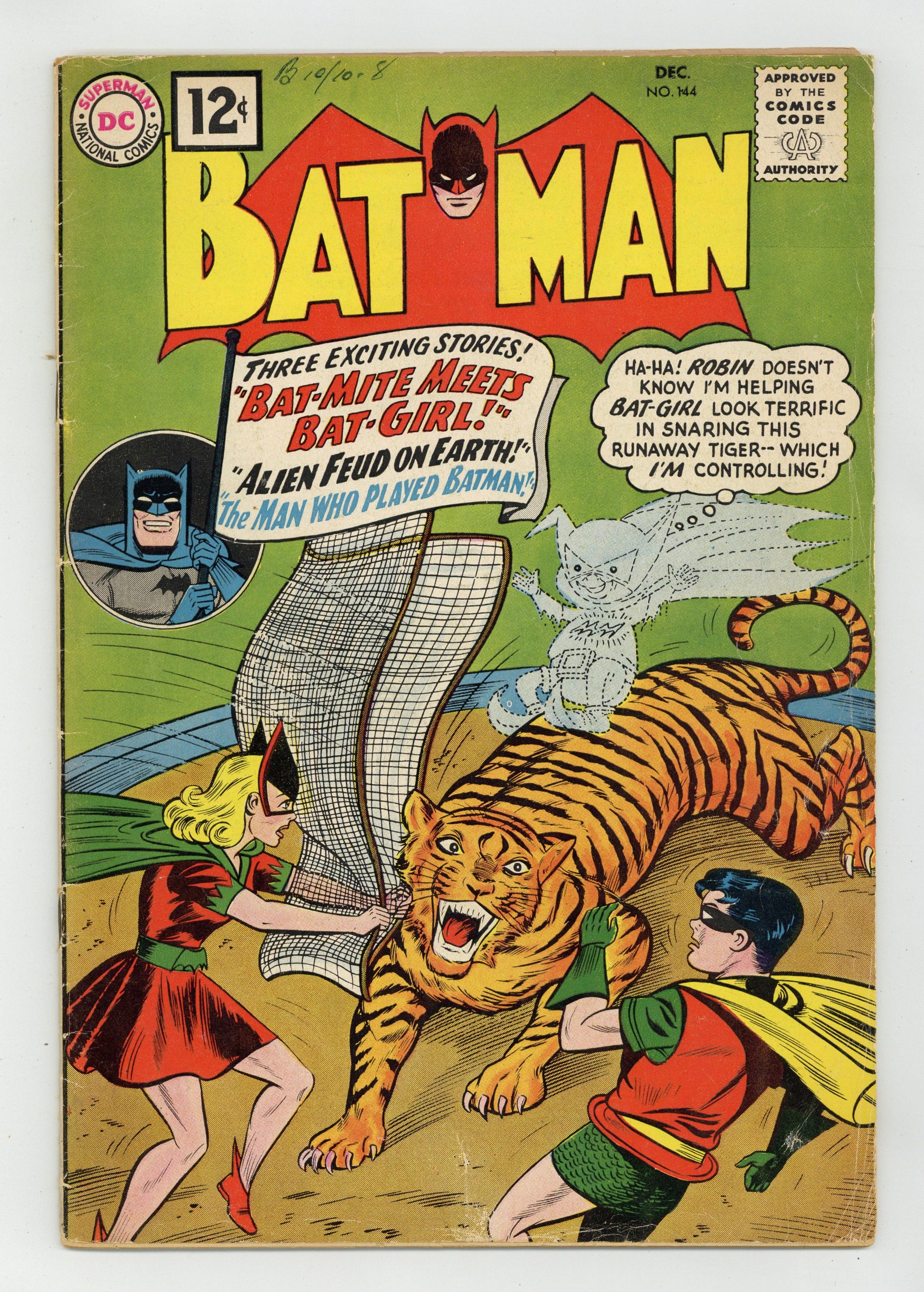 First 12-cent cover price. Cover by Sheldon Moldoff. "The Alien Feud on Earth," script by Bill Finger, pencils by Sheldon Moldoff, inks by Charles Paris; Two aliens come to Earth to fight a duel over a girl, and they don't care who gets in the way.Strange Laws humor/non-fiction page by Henry Boltinoff. "The Man Who Played Batman," script by Arnold Drake, art by Sheldon Moldoff; Batman secretly joins a training ground started by the Joker, whose express purpose is to defeat the Batman! "People Are People!" public service announcement, art by Don Cameron. "Bat-Mite Meets Bat-Girl," script by Bill Finger, pencils by Sheldon Moldoff, inks by Charles Paris; Bat-Girl gets seriously jealous when Robin tells her that there is another lady in his life, so Bat-Mite offers to help Bat-Girl get the man she loves. 36 Pages, Full Color. Cover price $0.12. Grade: GD/VG 3.0 explanation of grade Condition: Used (collectible)