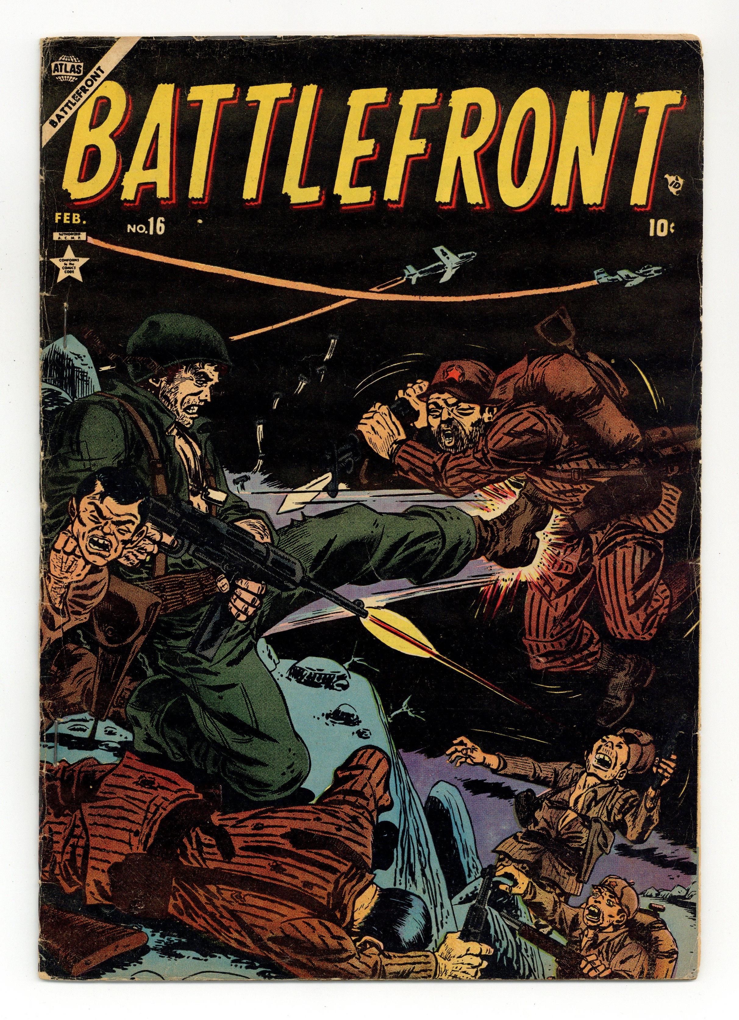 Note: The contents of this issue were likely intended for Battle Brady (1953) #16, but that series was cancelled with #14. Cover by Sol Brodsky. Written by unknown. Art by Syd Shores, Mort Lawrence, Norman Steinberg and unknown. Featuring three untitled Battle Brady stories: the first one pencilled by Syd Shores, the second one drawn by Mort Lawrence, and the third one drawn by Syd Shores. Plus: Sgt. Socko Swenski tale "Daylight Patrol" with art by Mort Lawrence. And: 2-page text story "The Big Test!" with illo by Norman Steinberg. 32 pages, full color. Cover price $0.10. Grade: VG- 3.5 explanation of grade Condition: Used (collectible)