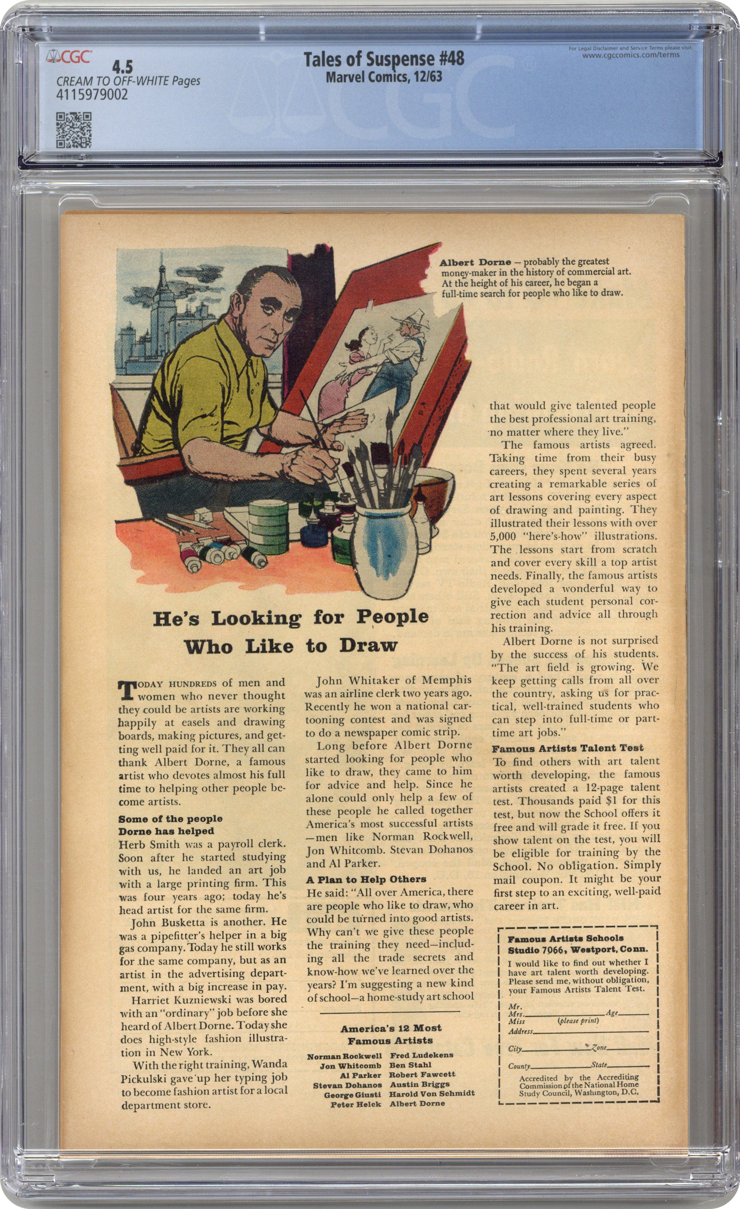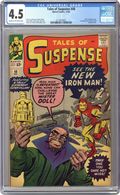 Ended Jan 18 2024 Winning Bid $195 Cover pencils by Jack Kirby, inks by Sol Brodsky. Iron Man gets a snazzy new costume in "The Mysterious Mr. Doll!", script by Stan Lee, pencils by Steve Ditko, inks by Dick Ayers; Mister Doll uses magic dolls to take over whole companies; Iron Man stops him with the help of a new suit of armor. "The Pact," art by Joe Maneely; An historian writing about the trial and execution of his ancestor for witchcraft interviews the only remaining party concerned in the case: the Devil. "Kraddak," script by Stan Lee (plot) and Larry Lieber (script), pencils by Larry Lieber, inks by George Roussos (as G. Bell); An alien tells a greedy mine owner that he will be killed in a fall; The mine owner hides at the lowest possible point in his mine. 36 pgs., full color. $0.12. Cover price $0.12. Grade: CGC 4.5 explanation of grade Condition: Used (collectible)