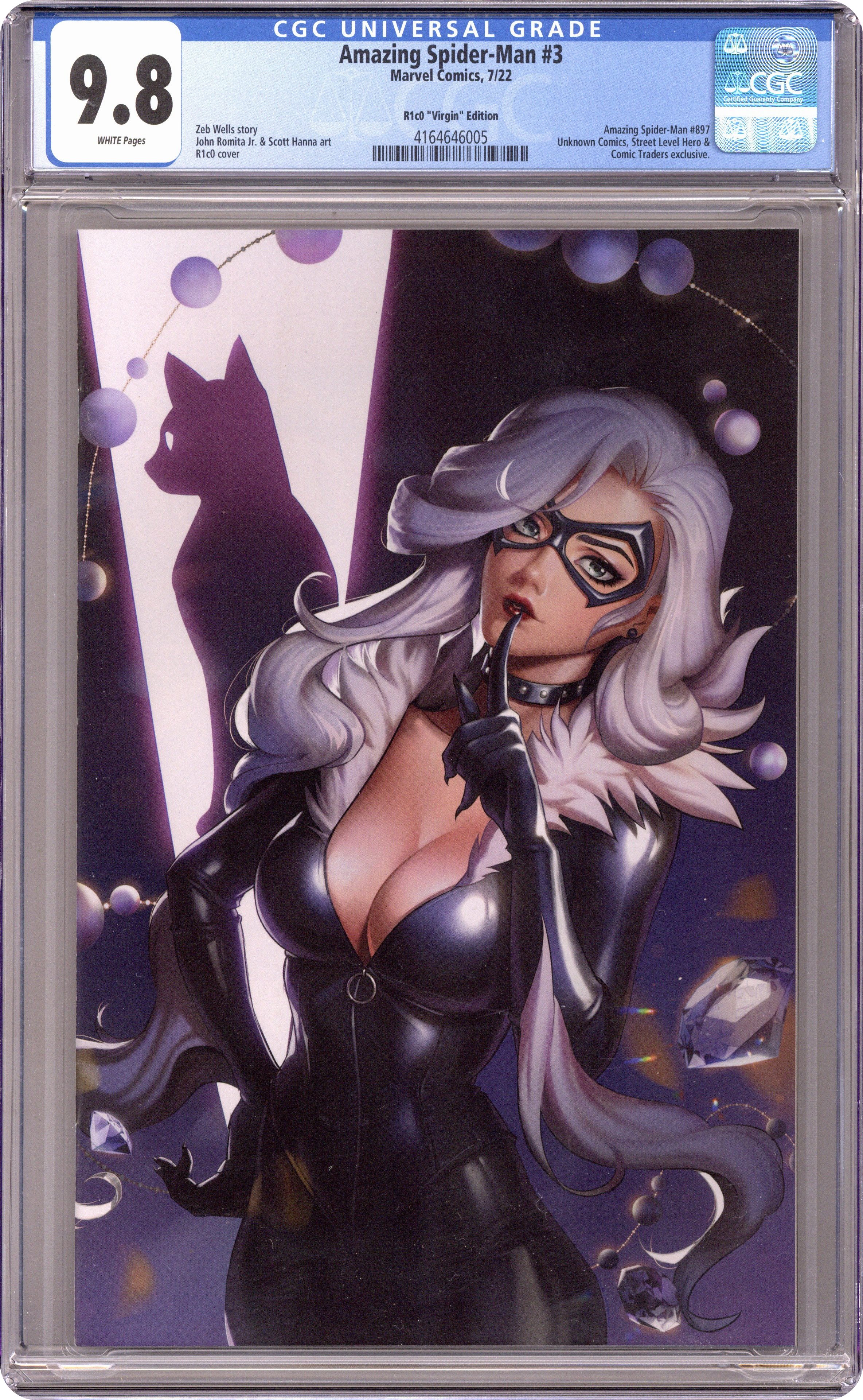 Ended Feb 20 2024 Winning Bid $61 Comics Illuminati (Unknown Comics, Street Level Hero, and Comic Traders) Exclusive Virgin Cover by R1C0. Written by Zeb Wells. Art by John Romita Jr. I know that this is just #3, but did you notice that it's LGY #897? That means something big is RIGHT AROUND THE CORNER! There are things you don't know about Tombstone. Neither you, nor Spider-Man, will ever forget them. 28 pages, full color. Rated T Grade: CGC 9.8 explanation of grade Condition: Used (collectible)