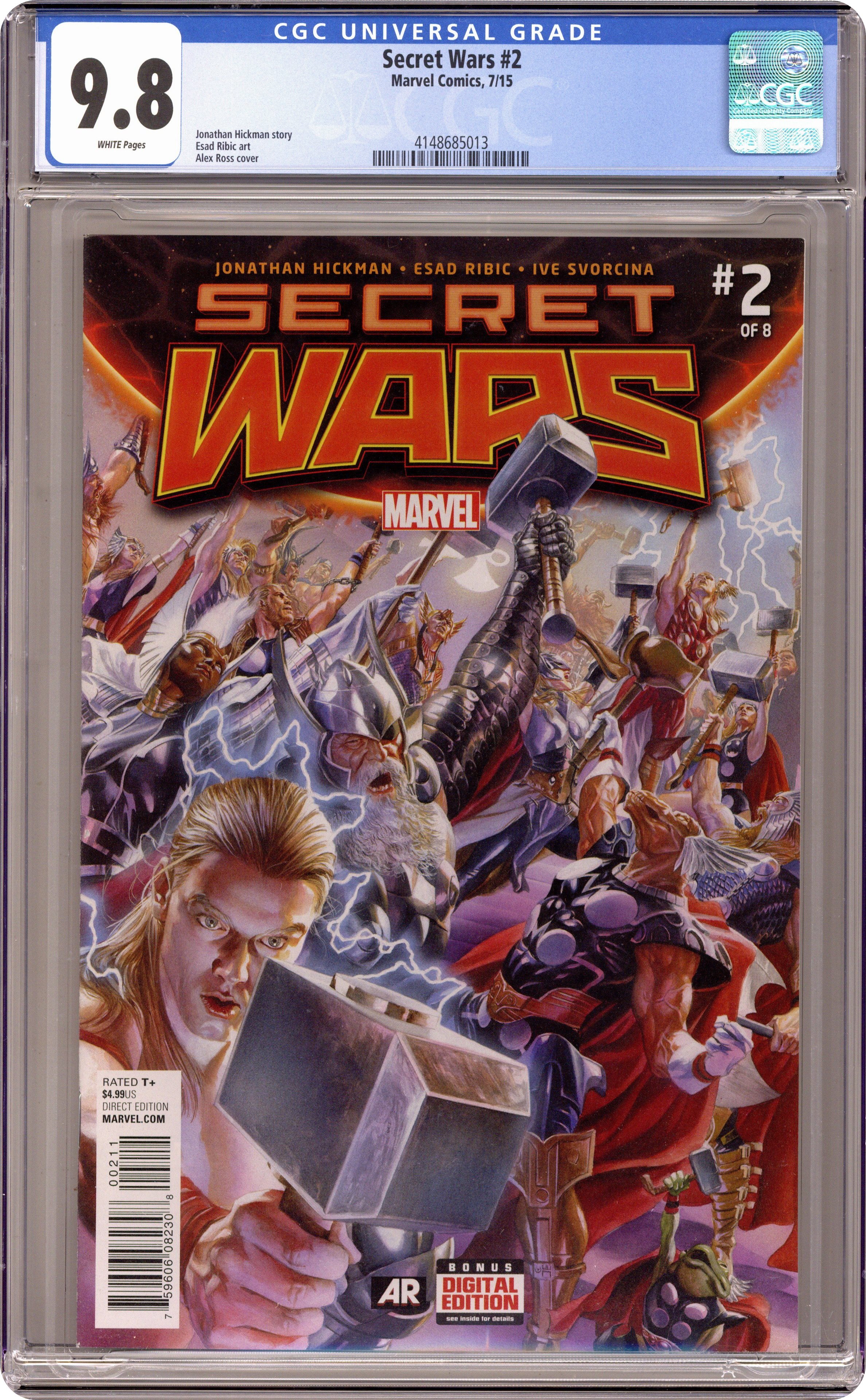 Written by Jonathan Hickman. Art by Esad Ribic. Cover by Alex Ross. When the Marvel Universe is gone, all that remains is Battleworld! Learn the secrets of this brave new realm in this special oversized issue! 52 pages, full color. Rated T+ Cover price $4.99. Grade: CGC 9.8 explanation of grade Condition: Used (collectible)