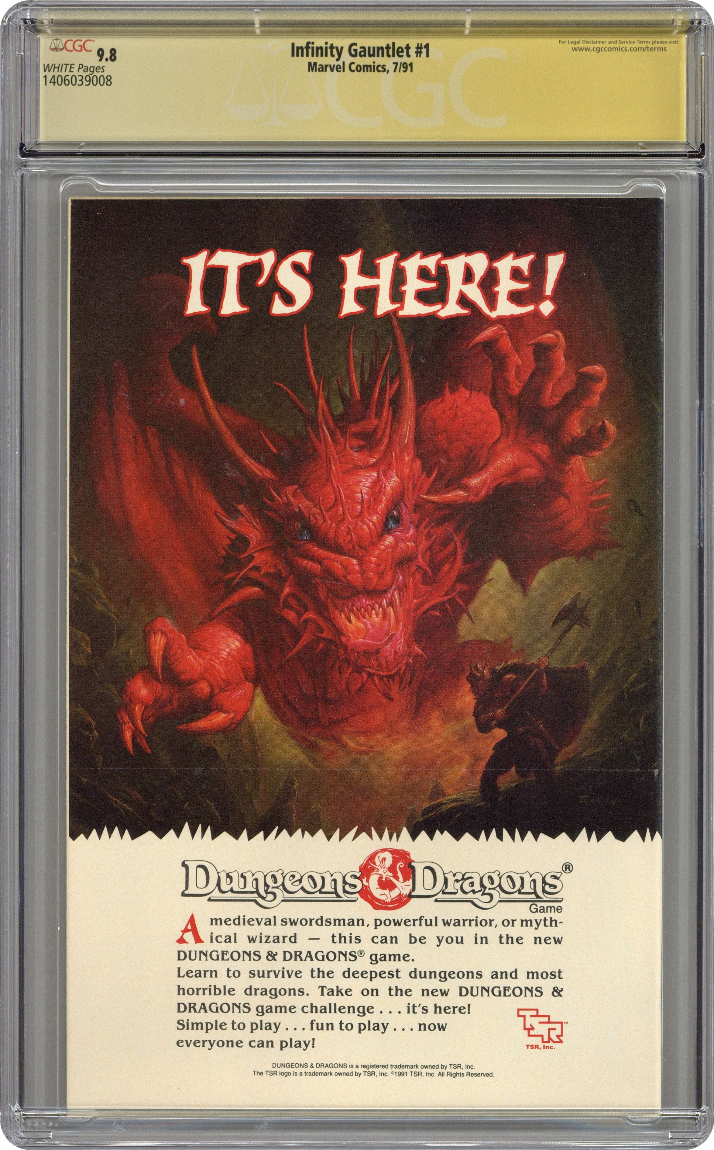 Direct Edition. Part 1 of 6. "God!" Story by Jim Starlin. Art by George Perez, Joe Rubinstein and Tom Christopher. Story continued from Thanos Quest #1-2 and Silver Surfer (1987-98 2nd Series) #50. The Silver Surfer crashes to earth and into the Sanctum Sanctorum of one Doctor Strange. The Sentinel of the Spaceways, barely alive after a grueling ordeal, arrives with the warning that the mad Titan, Thanos, has achieved ultimate power. Combining the Infinity Gems into the ominous Infinity Gauntlet, Thanos has become master of the mind, space, time, power, reality and the soul. And with his first act of nigh-omnipotent power Thanos eradicates half the population in the universe. Can the surviving heroes of Earth mount an offensive against this supreme power for evil and destruction, plus who are the mysterious new players who've just arrived on the scene? Cover price $2.50. Grade: CGC 9.8 explanation of grade Condition: Used (collectible)