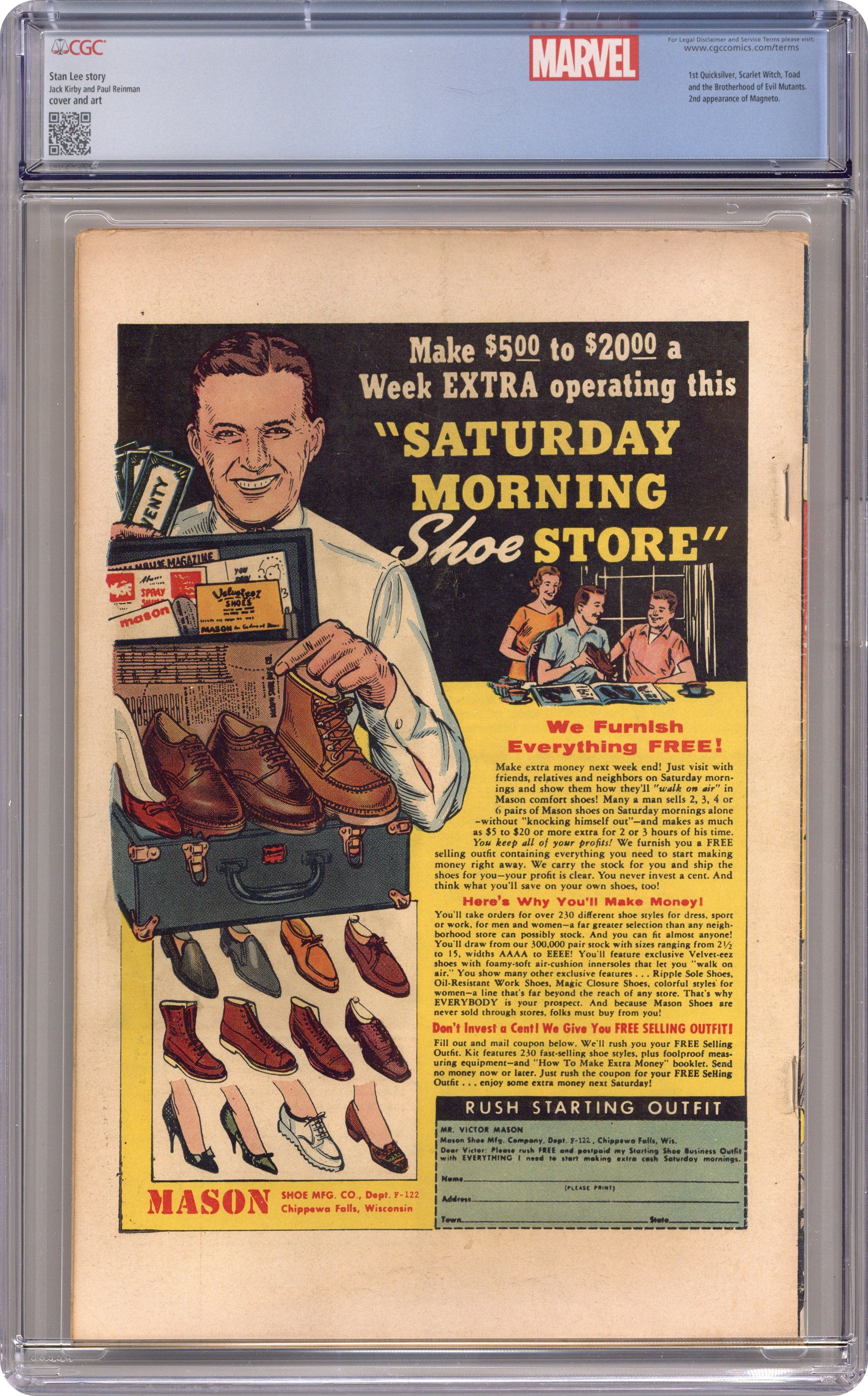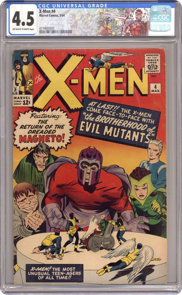 Quicksilver, Scarlet Witch, Mastermind, and Toad appear for the 1st time, and Magneto makes his 2nd appearance. Cover pencils by Jack Kirby. The Brotherhood of Evil Mutants!, script by Stan Lee, pencils by Jack Kirby, inks by Paul Reinman; Magneto and his new Brotherhood of Evil Mutants steals a freighter and uses it to take over the South American nation of Santo Marco; The X-Men invade and take the country back; Xavier is caught in an explosion and loses his mental powers. 36 pgs. Cover price $0.12. Grade: CGC 4.5 explanation of grade Condition: Used (collectible)