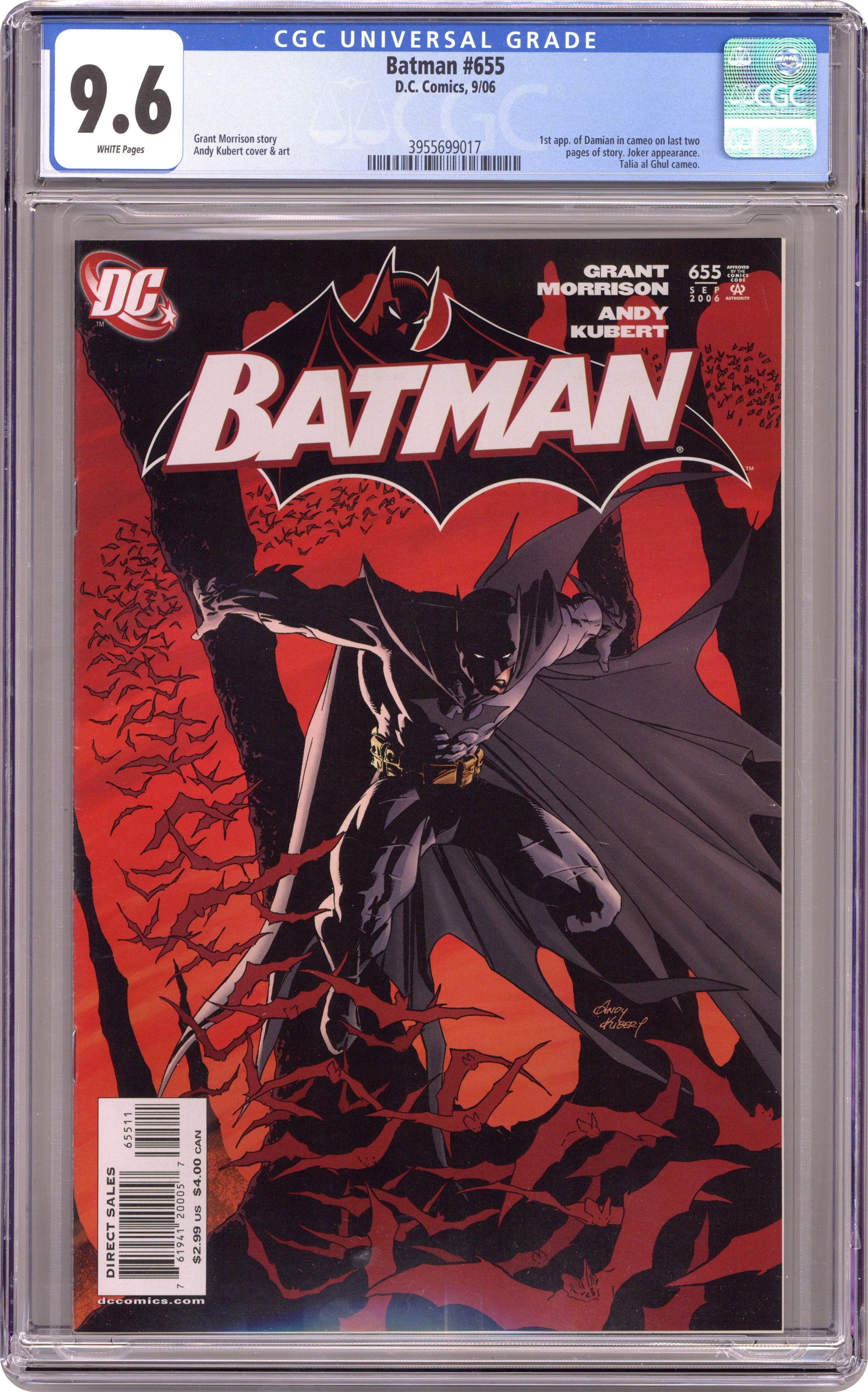 Direct Edition. Written by Grant Morrison. Art and cover by Andy Kubert. Variant cover by Adam Kubert. Comic legends Grant Morrison (ALL STAR SUPERMAN, SEVEN SOLDIERS) and Andy Kubert (Ultimate X-Men, 1602) come together for Part 1 of "Batman and Son." After a harrowing battle with the Joker high atop Police Headquarters, Batman decides to let Bruce Wayne step into the light. But just who is watching billionaire Bruce Wayne? And what does their plan have to do with Man-Bat? 36 Pages, Full Color. Cover price $2.99. Grade: CGC 9.6 explanation of grade Condition: Used (collectible)